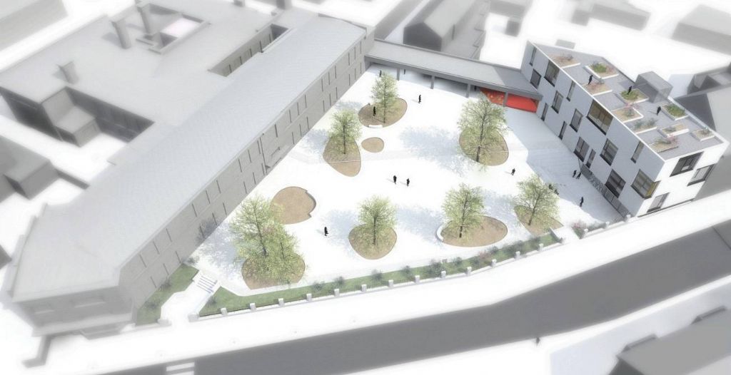 Comme l’infrastructure existante n’est pas appropriée à l’organisation de classes maternelles, il a été décidé de construire un bâtiment neuf à cet effet. A l’arrière de la cour se tiendra donc une nouvelle école passive comprenant 8 classes maternelles et une salle polyvalente. Une toiture verte intensive renforce la biodiversité du site.