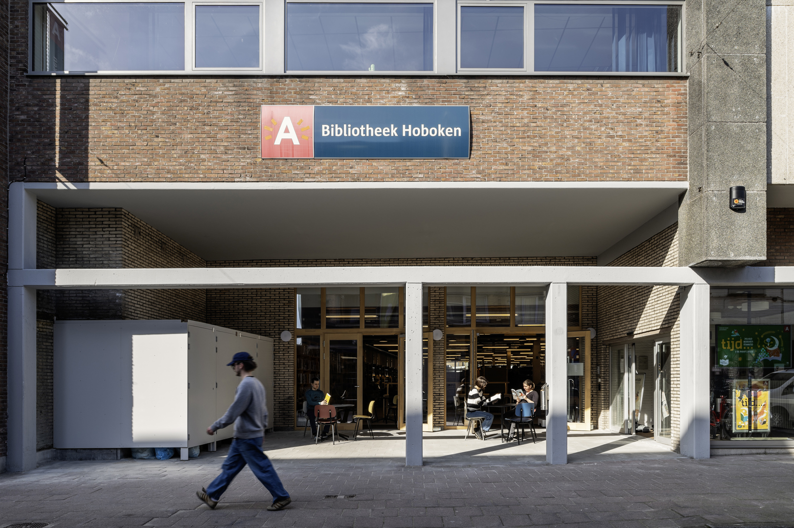 L'intérieur de la bibliothèque de Hoboken, située dans la Kapelstraat, a récemment fait l'objet d'une rénovation en profondeur. Le projet de rénovation, confié au bureau ROOILIJN architectuur, reposait sur les principes de rénovation circulaire et d'utilisation de matériaux biosourcés. Il a notamment donné lieu à l'installation d'un nouveau mobilier démontable, d'un nouveau revêtement de sol en linoléum composé pour près de la moitié de matériaux recyclés et biosourcés, et au réemploi des étagères existantes. La rénovation comprenait également la création d'un « makerslab » dans le bâtiment.