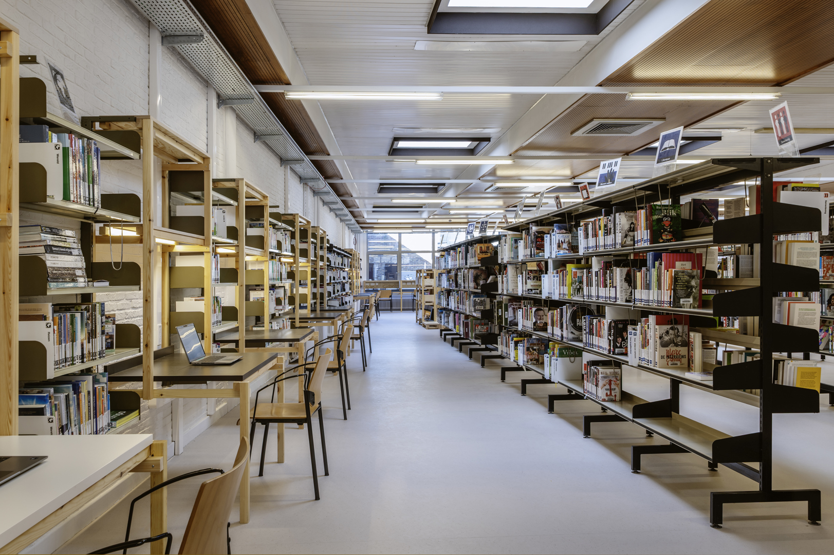 L'approche circulaire du projet par ROOILIJN architectuur, qui a fait appel à Studieburo Herelixka (techniques), Studiebureau Cobbaut (stabilité), Groep Dirk De Groof (EPB) pour les études nécessaires et à EVEKA pour la coordination de la sécurité, avait avant tout l'objectif de conserver au maximum les éléments existants. Par exemple, le plafond technique, en partie en bois, et les techniques n'ont pas été remplacés. Ces derniers ont toutefois été complétés par un système de ventilation et d'extraction avancé pour le nouveau lab. Les étagères et les rayonnages ont aussi retrouvé une seconde vie dans la bibliothèque 2.0.
