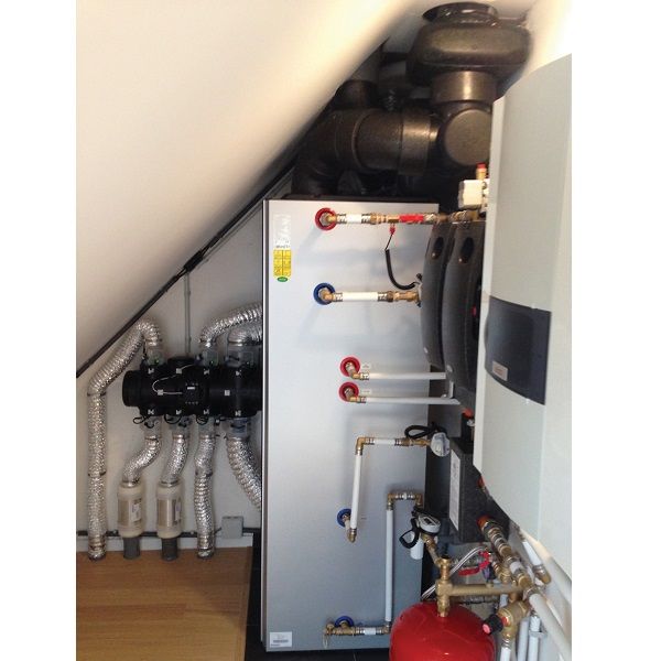 La particularité de ce système est que l’air chaud de l’extraction n’est pas immédiatement évacué vers l’extérieur, mais utilisé pour la technologie de la pompe à chaleur intégrée au système. S’il n’y a pas de demande de chaleur, le Système E+ fonctionne uniquement en tant que système de ventilation commandé à la demande. Dès qu’il y a demande de chaleur pour le chauffage ambiant ou l’eau chaude sanitaire, la technologie de pompe à chaleur air/eau se met en fonction. La pompe à chaleur amène la chaleur provenant du mélange d’air (air chaud de l’évacuation / air frais de l’extérieur) à une température supérieure et utilise la chaleur pour le chauffage ambiant (au moyen d’un échangeur de chaleur à plaques) et l’eau chaude sanitaire (au moyen d’un serpentin autour du chauffe-eau). Le système comporte un réservoir d’eau chaude de 300 litres (4 à 6 personnes) pour l’eau chaude sanitaire. Lorsque la demande de chaleur est à un moment donné supérieure à la capacité de la pompe à chaleur, une chaudière classique à condensation entre en action. Un système intégré ‘Energy Analyser’ veille à ce que ce soit chaque fois la source d’énergie la plus économique qui soit utilisée.