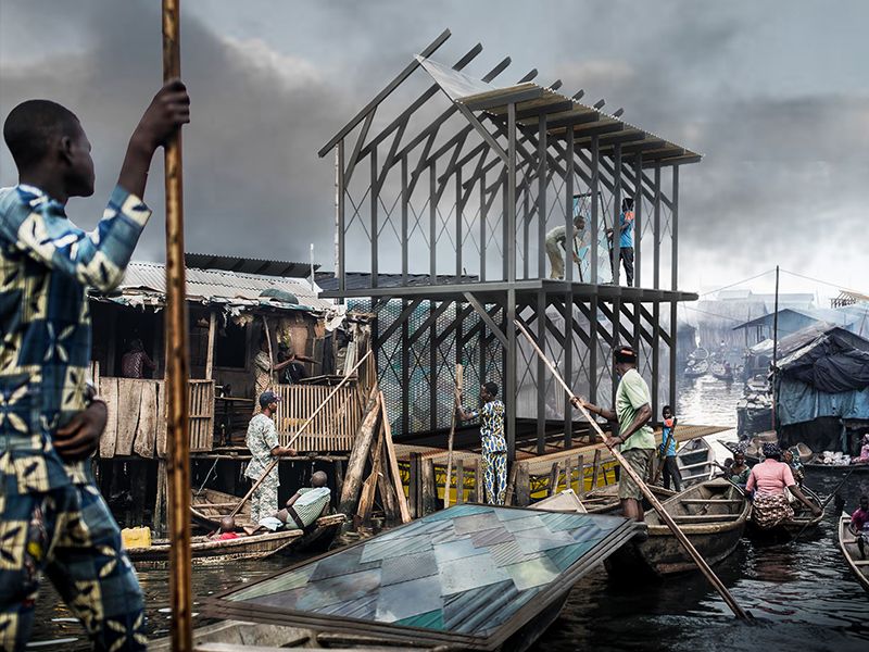 Ils étaient douze finalistes français à défendre leur projet devant le jury du concours Acier 2019, organisé par ConstruirAcier et présidé par l’architecte Hélène Fricout-Cassignol. Parmi les lauréats, nous nous intéresserons plus particulièrement au 3e prix ex aequo, Scales, émanant de 3 étudiants de l'Ecole Nationale Supérieure d'Architecture de Nancy : des maisons flottantes tout en acier (barge, structure, toiture) pour vivre, au Nigéria, sans crainte des inondations.