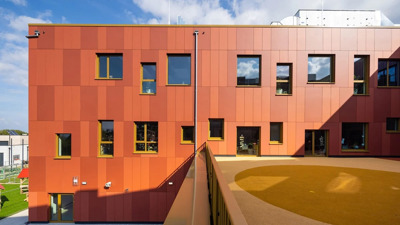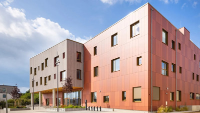La commune de Dudelange souhaitait développer un nouveau concept scolaire dans le quartier Lenkesschléi. Elle voulait réunir, pour la première fois, sous un même toit des services de garde d’enfants avant et après l’école, une école préscolaire et primaire et un centre sportif. Pour réaliser ce projet, la commune s’est mise en quête d’un architecte, par le biais d’un appel d’offres public. C’est l’entreprise de construction IBB en collaboration avec l’atelier d’architecture Decker, Lammar et Associés qui a remporté le marché. Le résultat de leur conception ? Un jeu de couleurs étonnant de deux teintes rouges d’EQUITONE [natura].