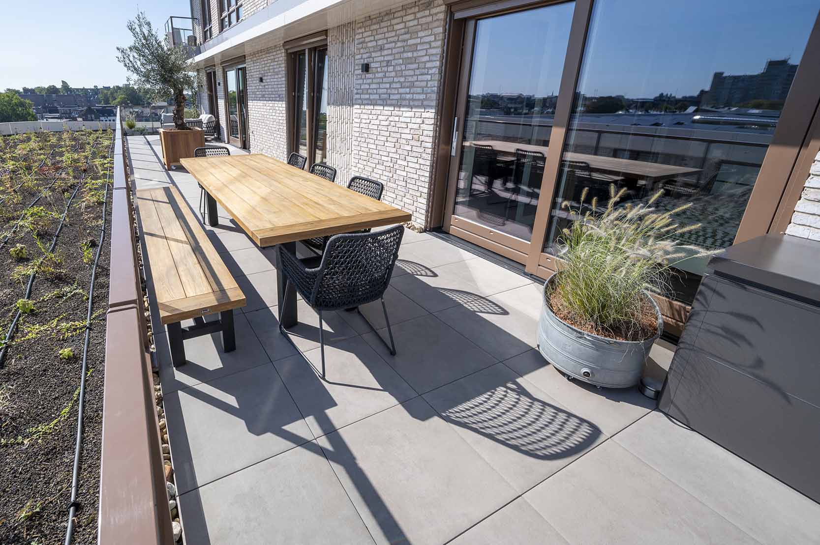 Autre avantage de ce remplissage des microcavités : la saleté et la poussière adhèrent beaucoup moins. Les dalles Sensitech sont donc plus faciles et plus rapides à nettoyer que les dalles antidérapantes classiques. Cela réduit considérablement le temps et les coûts d’entretien, un atout majeur pour les lieux très fréquentés comme les rooftops, les terrasses d’hôtels ou les esplanades publiques. La surface reste esthétique plus longtemps, sans nécessiter d’entretien intensif.