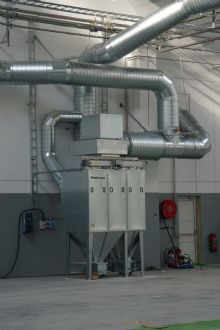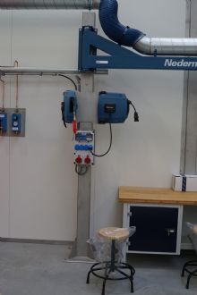 Ensemble, une proposition a été élaborée avec 14 bras d’extraction, flexibles allongés, de type NEX MD (medium duty). Les bras sont placés sur des supports, dans les différentes zones, pour assurer un ajustement parfaits à chaque zone de soudure. Ces bras combinent une grande portée (8m) et un débit (1200 m³/h) avec une flexibilité et une facilité d’utilisation sans précédent. Chaque bras est équipé d’un bon clapet de fermeture très important pour eux parce qu’ils combinent la possibilité de meulage et de soudage TIG. Tous ces bras sont reliés par une canalisation centrale avec une installation de filtre entièrement automatique de type FMC 6A, équipée des nouvelles cartouches de filtre Nano fibre, avec une efficacité de capture de plus de 95% sub micron. Pour assurer une protection maximale du soudeur et de la meuleuse, associée à une consommation d’énergie et une perte de chaleur minimales, l’unité de filtration est équipée d’un contrôle de fréquence automatique et d’un système de clapet été/hiver en sortie. De cette façon, nous obtenons une prise d’énergie minimale basée sur le nombre de bras de soudure ouverts et dans les périodes froides l’air filtré est totalement ou partiellement récupéré.