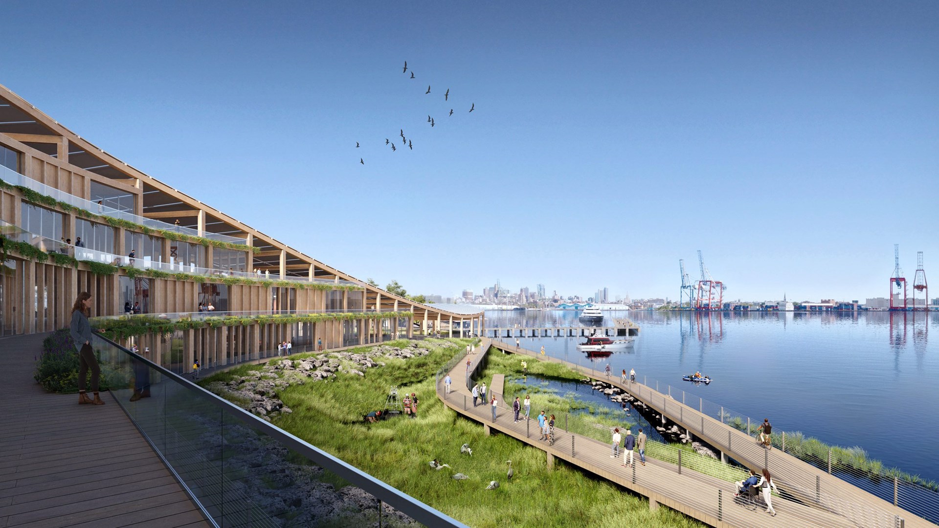 Le bâtiment comprendra huit étages pour le plus haut et quatre pour le plus bas. La façade est constituée de grilles de poutres en bois encadrant des vitrages, tandis que la section du bâtiment la plus proche de l'eau aura des murs en bois avec des fenêtres plus petites et des jardinières entre les étages.