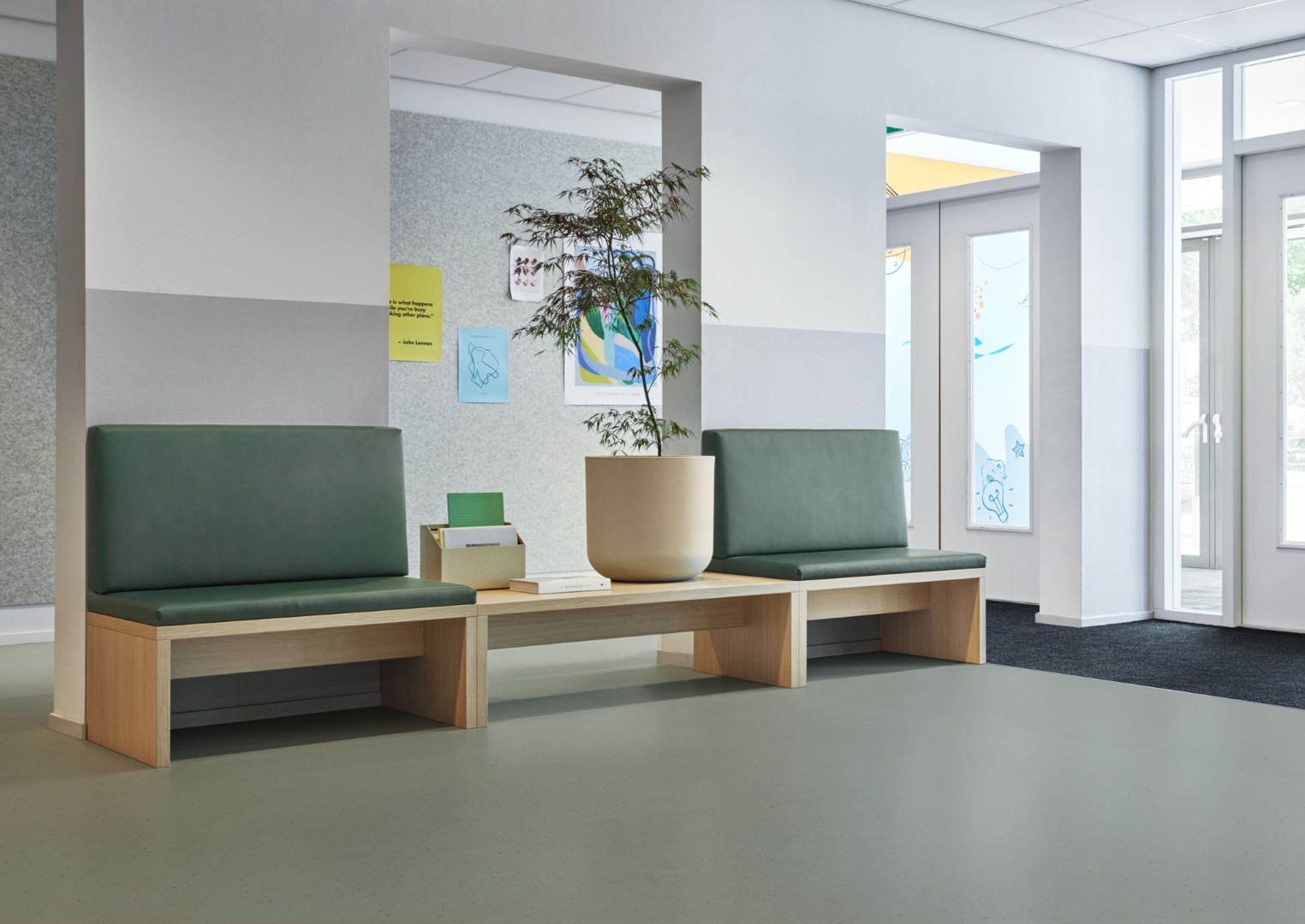 De subtils éclats transparents ton sur ton créent profondeur et nuance. Cet effet s’exprime particulièrement dans les environnements de soins et d’enseignement, où une matérialité douce et peu contrastée est recherchée. La finition mate limite les reflets et favorise une perception lumineuse apaisée, un point d’attention important dans les espaces bénéficiant d’une abondante lumière naturelle ou artificielle.
