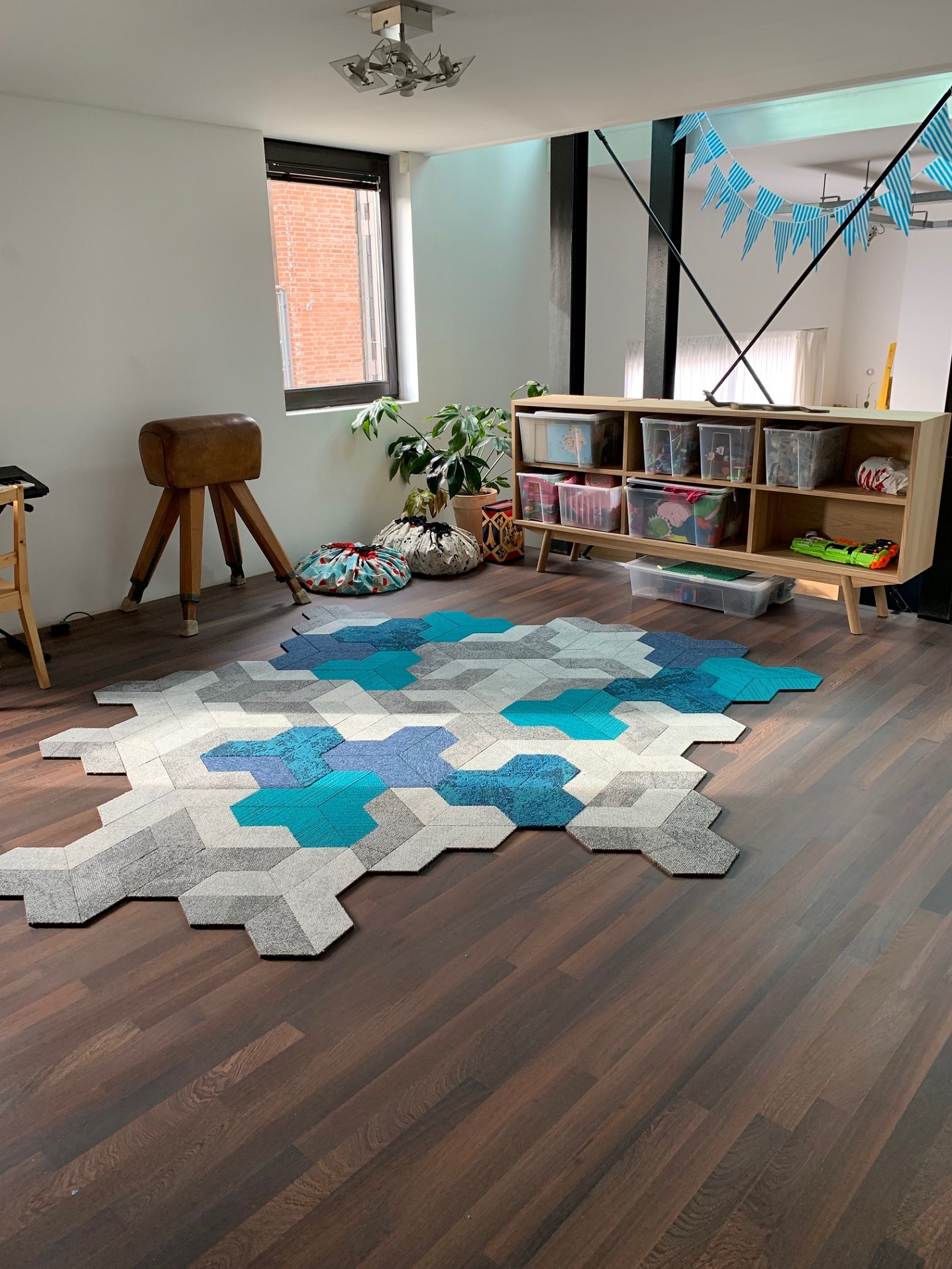 A côté de la durabilité, la beauté est également un pilier important pour Studio Wae. « La durabilité doit également être esthétique, elle doit stimuler et inspirer l’utilisateur », explique Tynke van den Heuvel. « Nous voulons transformer les déchets en art. La forme des carrelages est inspirée de l’art de M.C. Escher. La collaboration avec Interface a conduit à la création de l’emblématique carrelage Boomerang ». Pour la mise en place dans un intérieur, les carrelages faits à la main peuvent être combinés selon plusieurs formes en fonction des souhaits. Le résultat est une forme géométrique unique composée de motifs symétriques et asymétriques. Les irrégularités du tissu constituent un plus. « Les défauts associés à la propre interprétation des formes géométriques confèrent à chaque sol modulaire un caractère unique », conclut Tynke van den Heuvel.