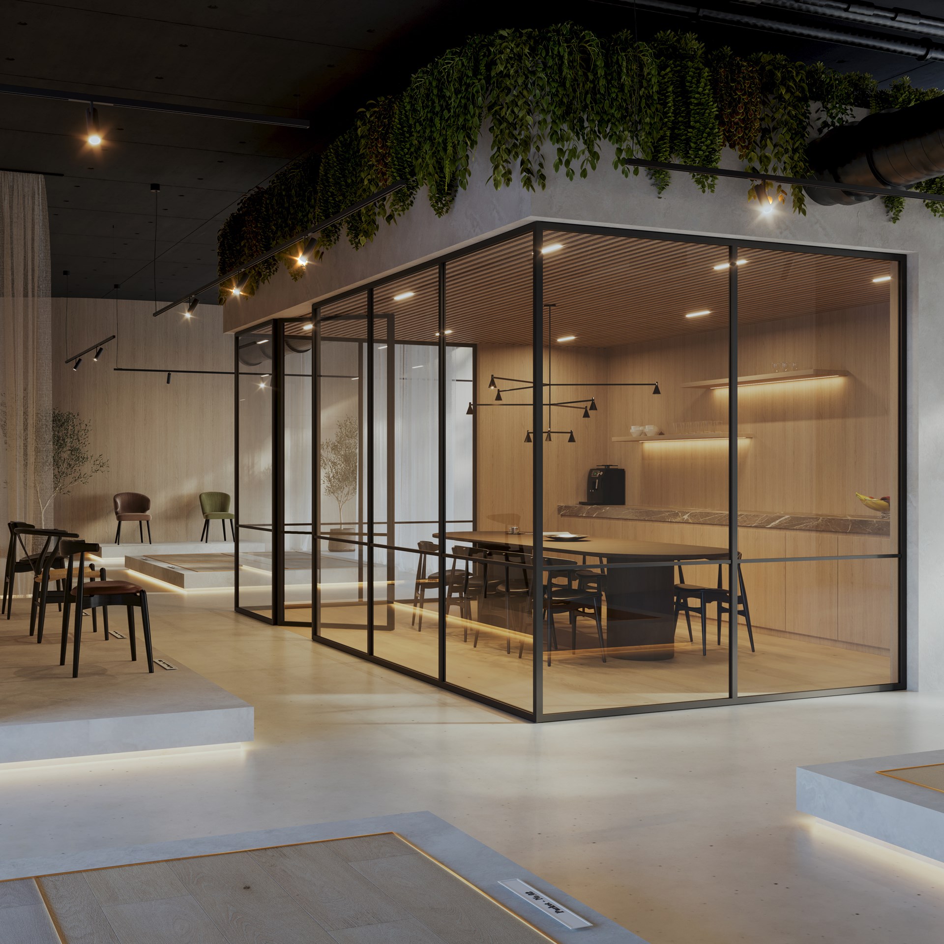 Charnières et serrures Divina va au-delà des solutions existantes en matière de parois intérieures en verre. La possibilité d'intégrer une porte à hauteur de pièce jusqu'à 2 800 mm, équipée de charnières tyo invisibles et réglables en 3D, garantit le design épuré des profilés sans discontinuité. Une première sur le marché des murs et des portes en "aspect acier". Plus précisément, la serrure magnétique argenta magnotica pro est également intégrée de manière invisible dans le profil. Le mécanisme de verrouillage n'est plus nécessaire et c'est invisible même lorsque la porte est ouverte. Un joint d'étanchéité entre la porte et le mur permet également une meilleure atténuation acoustique et une meilleure isolation.