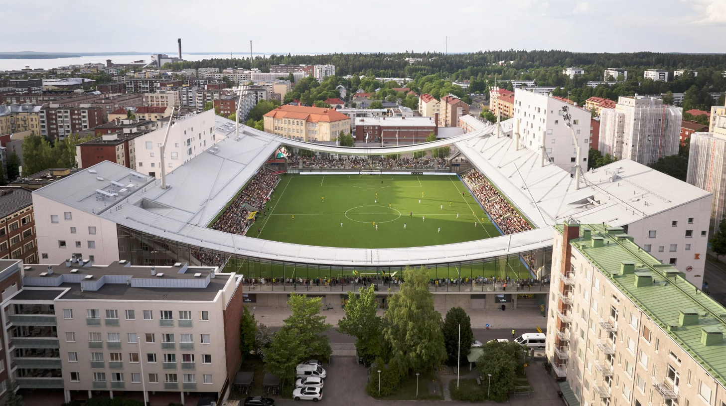Les gradins inférieurs, protégés par deux canopées courbées, créent une signature visuelle singulière que l’architecte décrit comme un "sourire captivant" sur la skyline de Tampere. Grâce à ces choix architecturaux, chaque siège du stade bénéficie d’une vue dégagée sur le terrain.