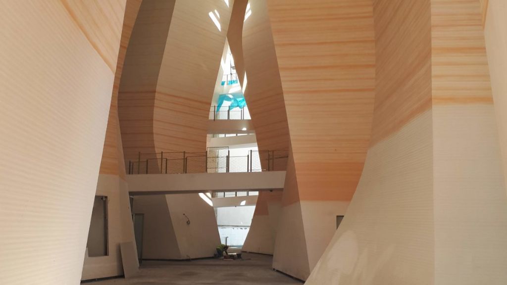 Le projet lauréat se compose de plusieurs pavillons à l’image d’une médina dans la ville. « Au lieu d’un objet architectural autonome, univoque, cet ensemble fluide se joue de la symétrie sans s’y opposer, et invite à pénétrer dans l’ombre d’un autre univers intérieur, en ouvrant plusieurs failles et entrées, fines, attirantes, vers une grande et haute galerie publique traversante formée de piliers incurvés de staff rouge », explique Christian de Portzamparc. « Dans la simplicité extérieure de l’architecture blanche, les failles attirent le passant vers l’ombre, le clair-obscur de ce parcours et de ce lieu d’entrée, passage où l’on vient s’assoir dans les cafés installés ici car l’air y est rafraîchi par la ventilation naturelle. Sur les bâtiments de la place se déploie un voile de moucharabié de terre cuite et résine. »
