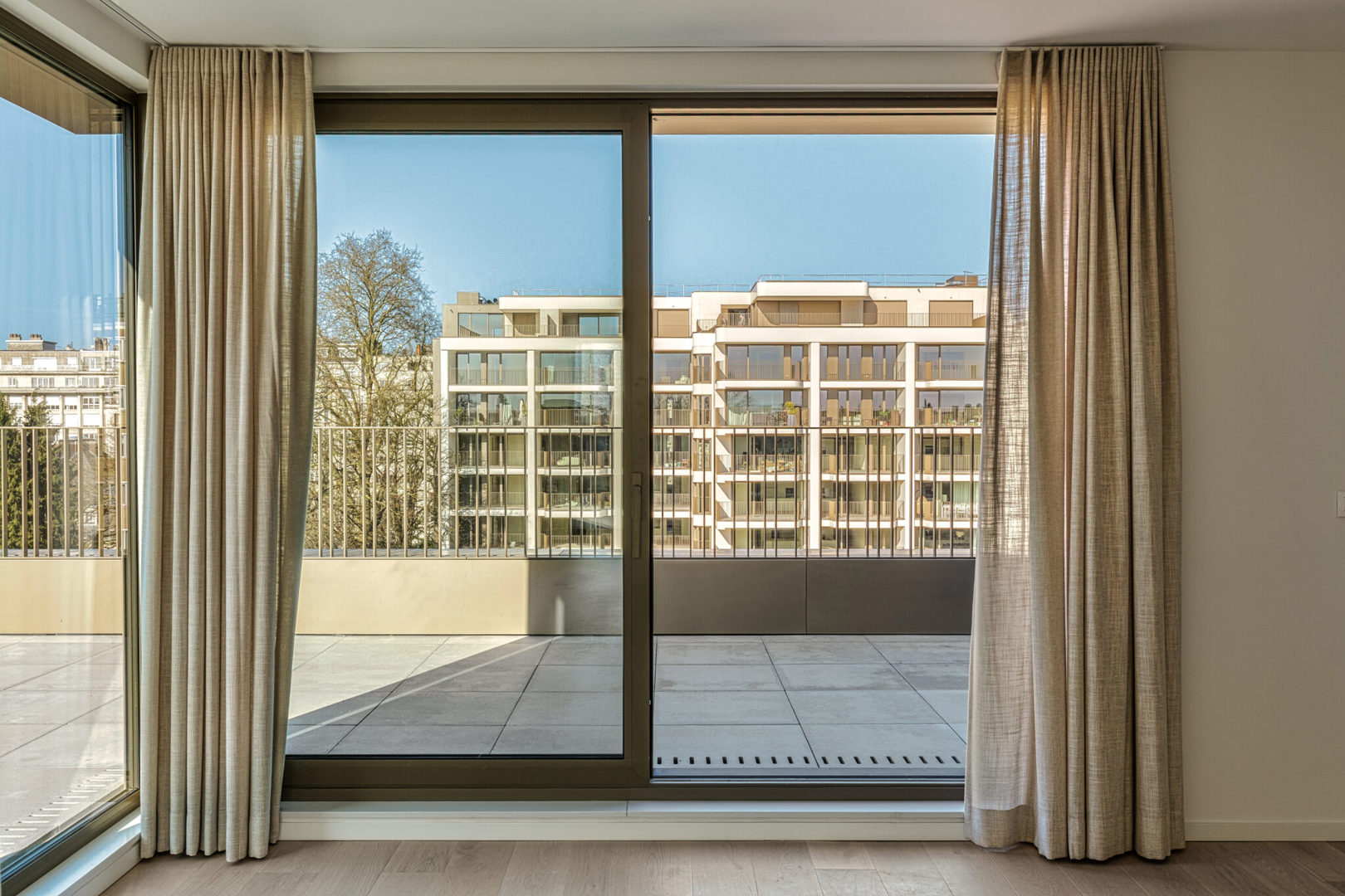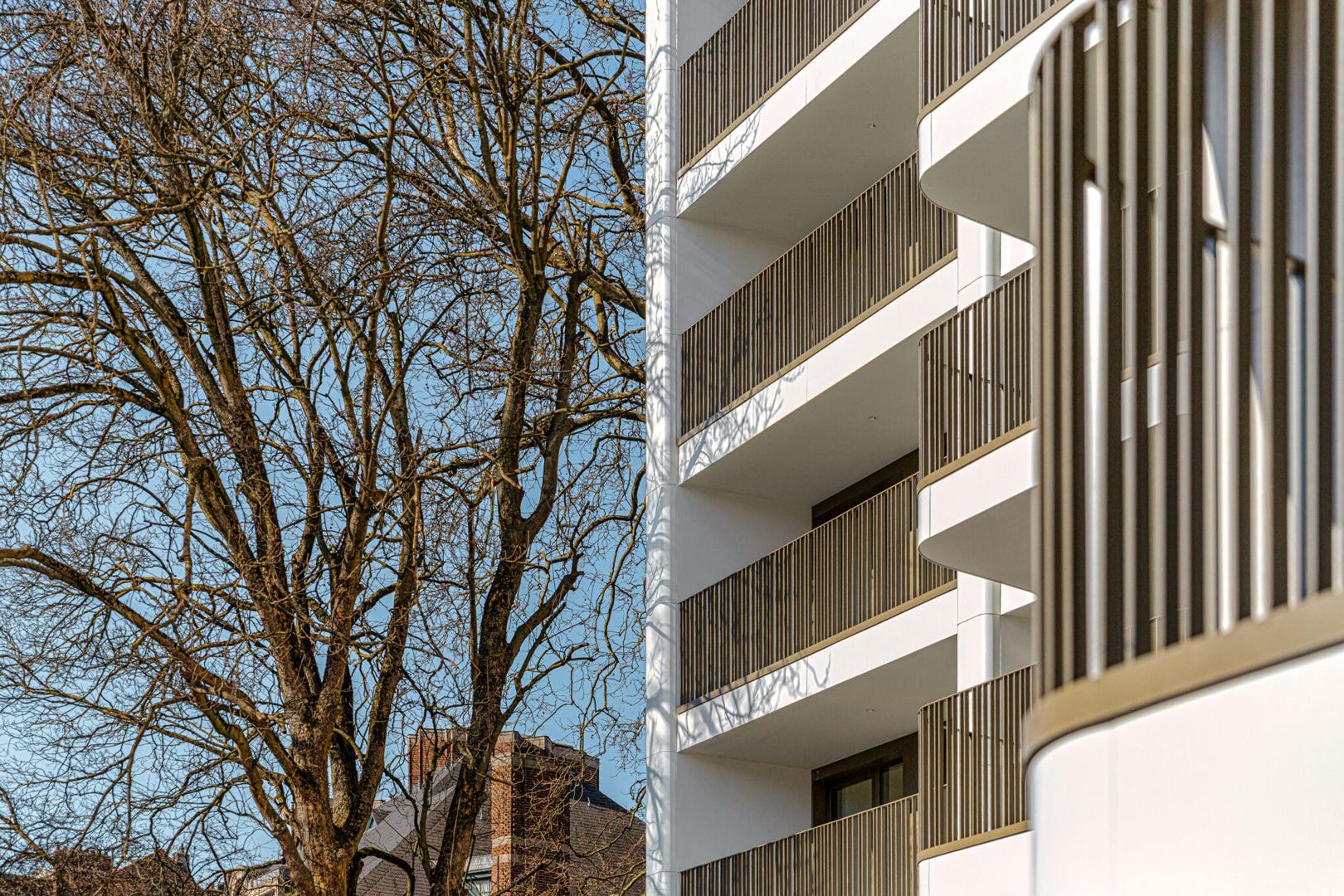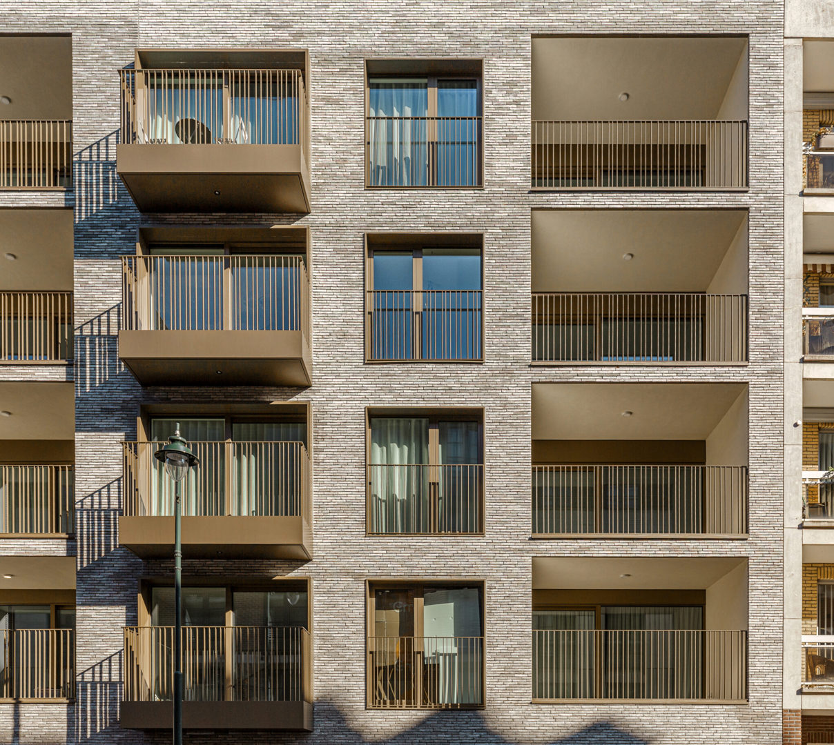 Les trois bâtiments bénéficient chacun d’une identité architecturale propre, en adéquation avec le caractère de la rue dans laquelle ils s’inscrivent, tout en étant reliés par le jardin intérieur commun. Les façades sont réalisées en pierre naturelle claire et agrémentées de tons bronze chaleureux pour les profils de fenêtres et de portes, les garde-corps et les corniches. L’origine locale et européenne des matériaux constitue à cet égard une exigence absolue.