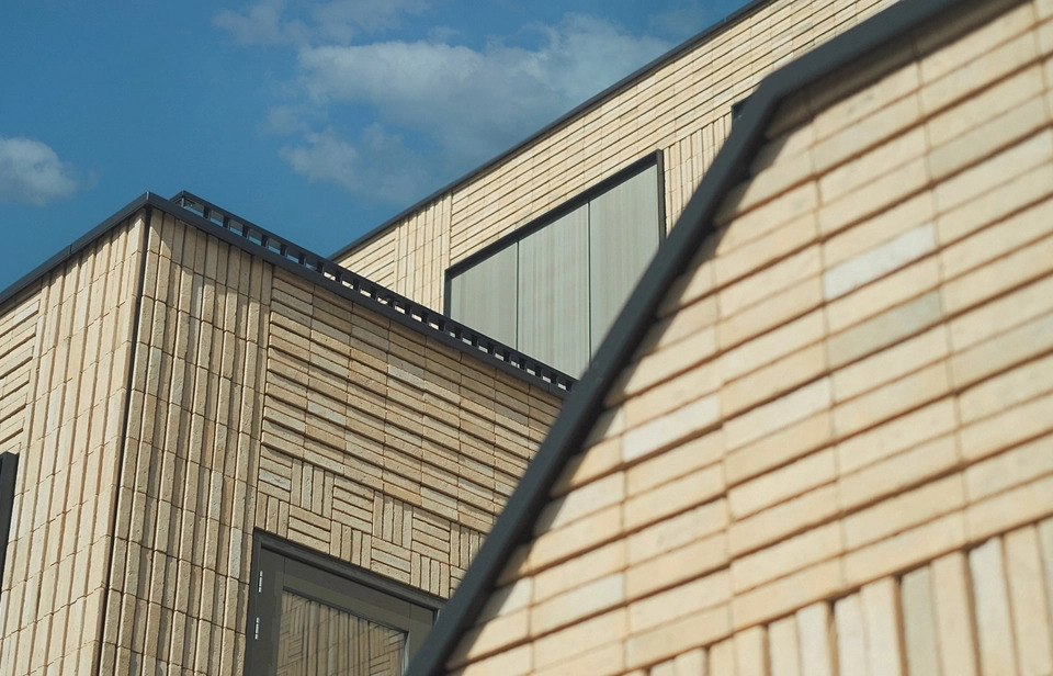 Nous avons opté pour les plaquettes de parement multicolores Freya de Vandersanden. Nous les avons sélectionnées en raison de leur couleur jaune pâle nuancée d’ocre et de gris, et de leur texture intéressante. Grâce à son style distinctif, cette brique de parement était la solution idéale pour donner forme à notre projet. Les briques de la façade de The Cube ont deux profondeurs différentes, ce qui accentue encore le jeu de lignes horizontales et verticales et fait de l’immeuble un élément remarquable dans le paysage visuel.