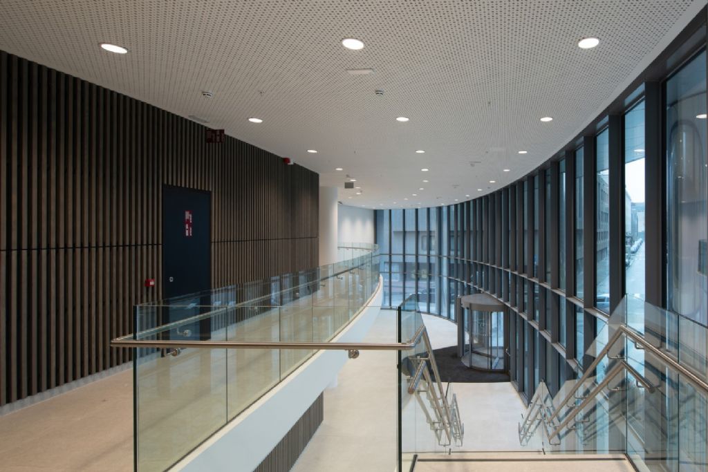 Charlie Malou, architecte associé ayant géré la conception d’exécution et le suivi de chantier : « Le système de plafonds rayonnants est un optimum énergétique et acoustique. Malgré la forme du bâtiment, les îlots sont rectangulaires, sans pertes de matière, et l’espace entre eux permet de bénéficier de l’inertie de la dalle en béton. Ils ne touchent pas la façade et sont laissés sans cache-rail. On voit donc le béton, les gaines, … un côté brut qui a été bien accueilli par Allianz ». Une certaine sobriété dans les finitions qui colle bien à la philosophie BREEAM. Là où certains tentent de faire impression avec un jeu de matériaux fort complexe, ici la forme, la lumière et la vue suffisent, le reste est superflu.