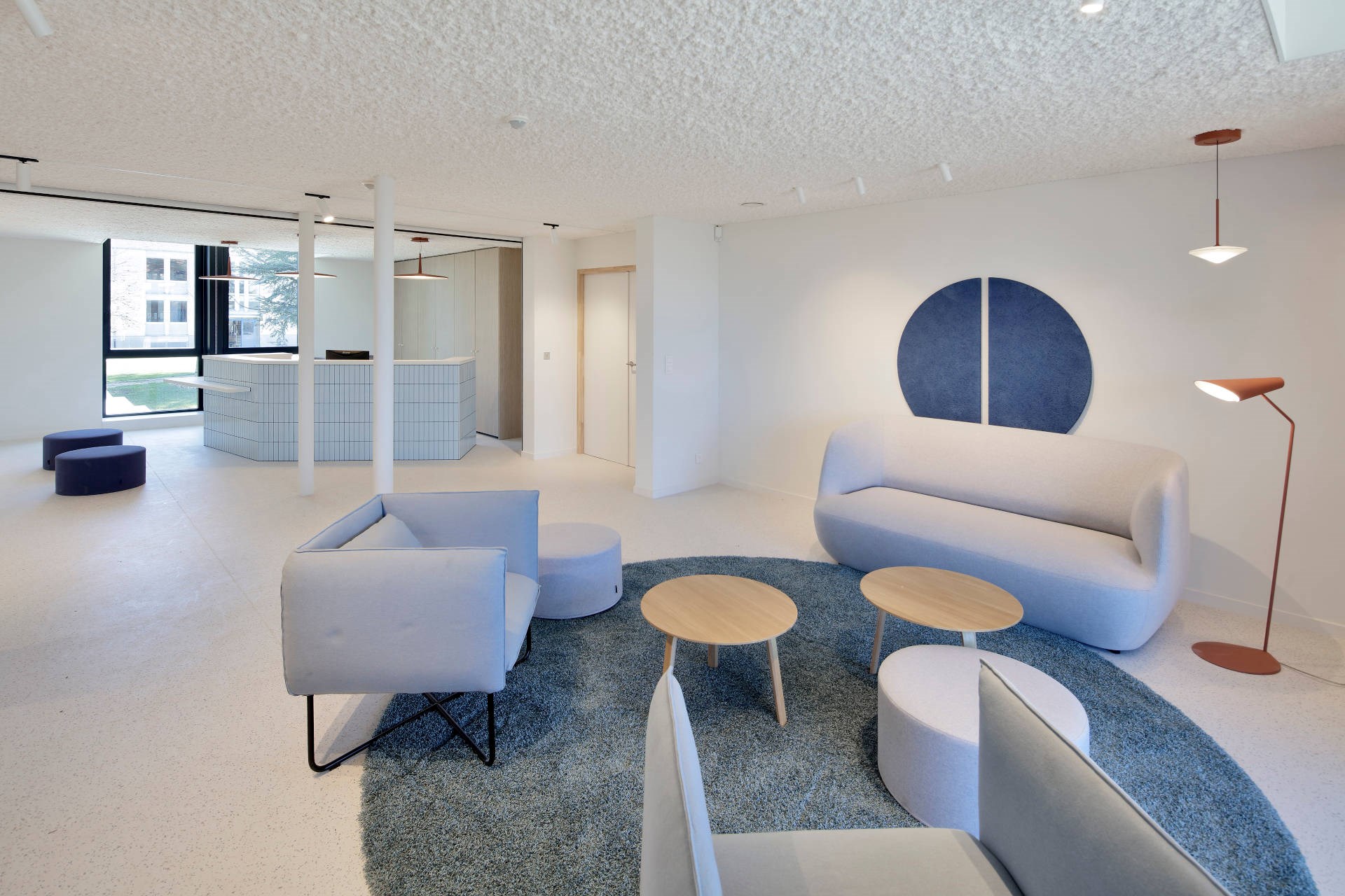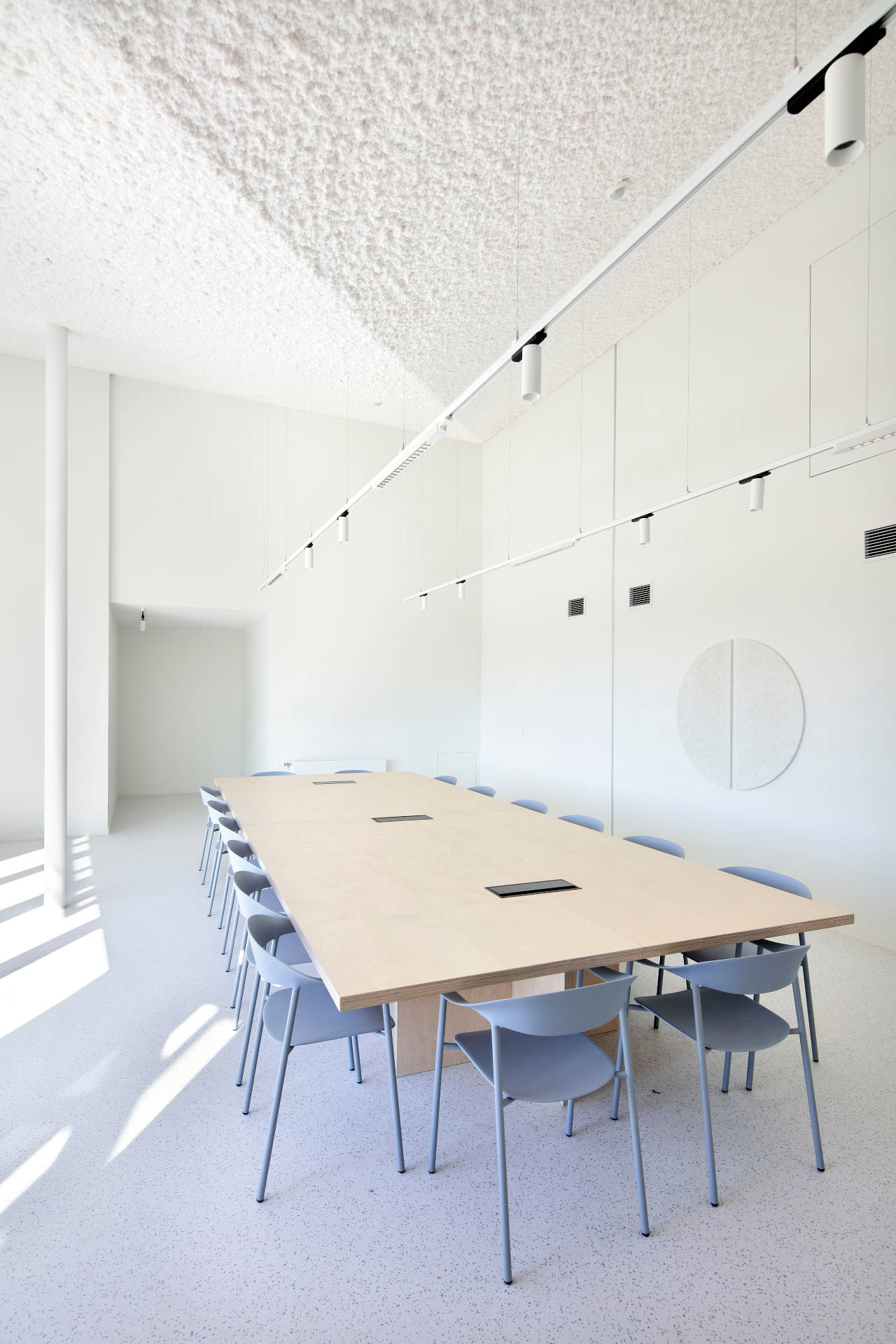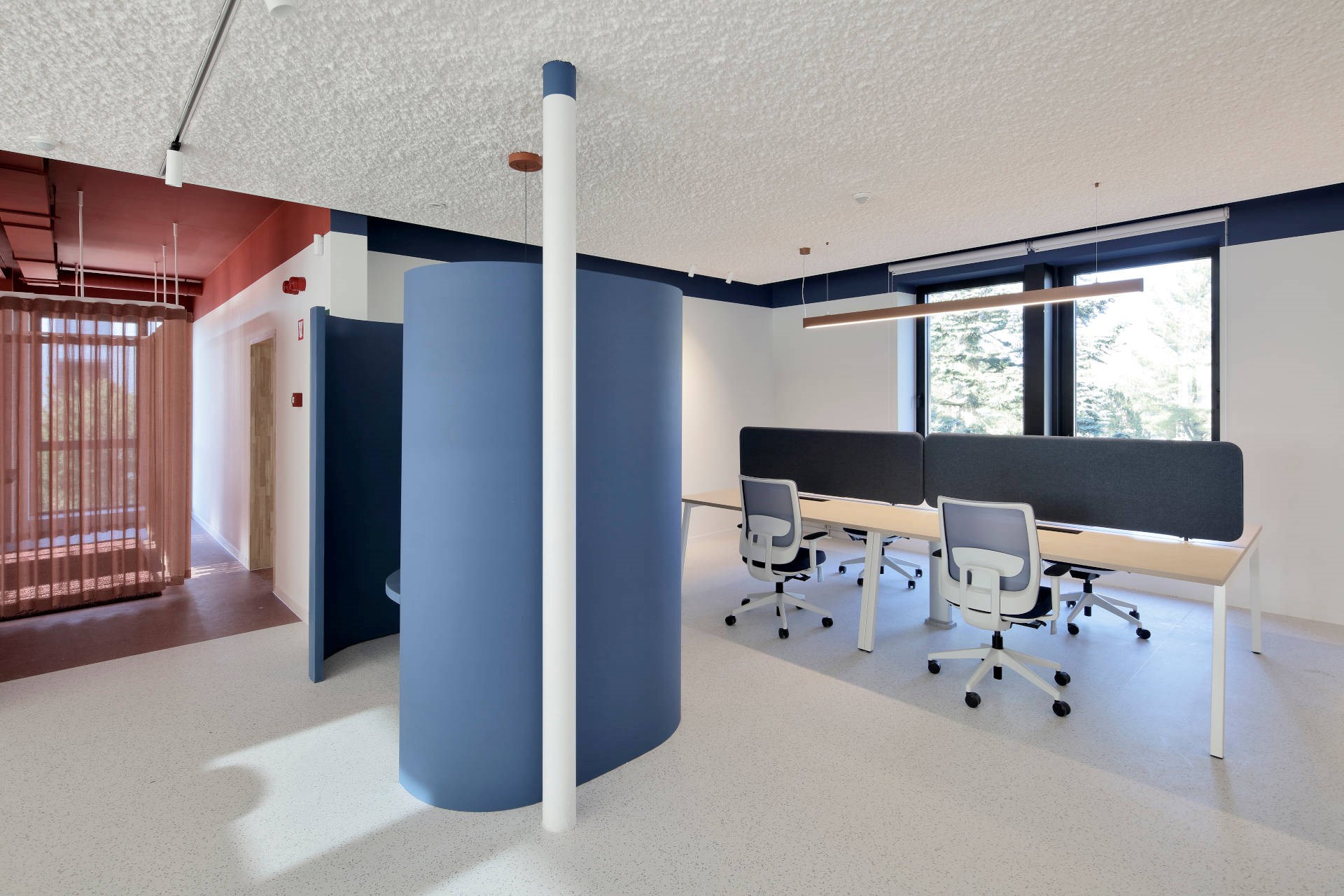 À l'intérieur, UMAN Architect a complètement repensé l'espace pour répondre aux exigences d'un milieu professionnel moderne. Le centre offre maintenant cinquante postes de travail modulables, des espaces de réunion, des zones communes, et une salle de traduction, tous conçus pour encourager l'échange et la collaboration.