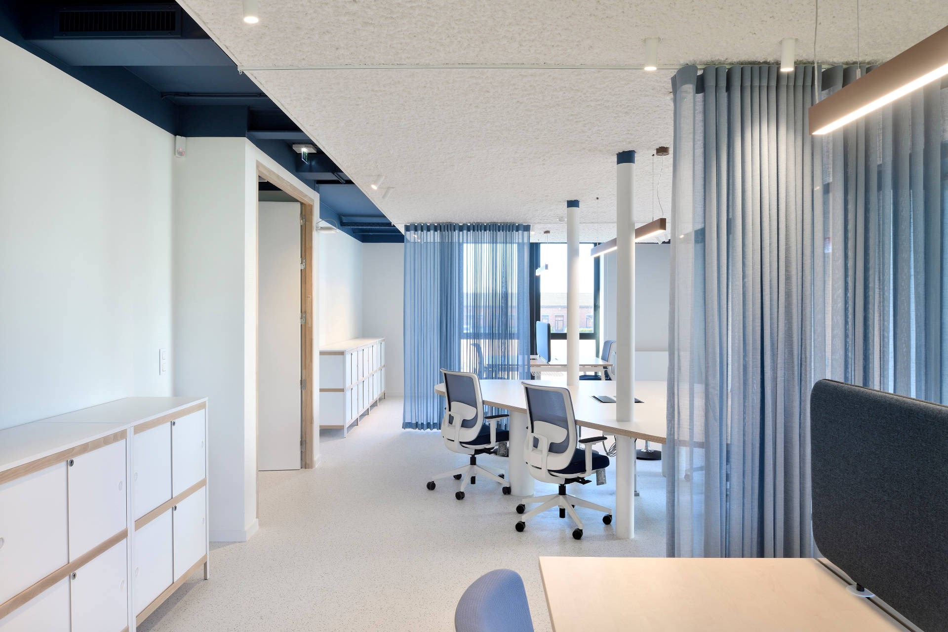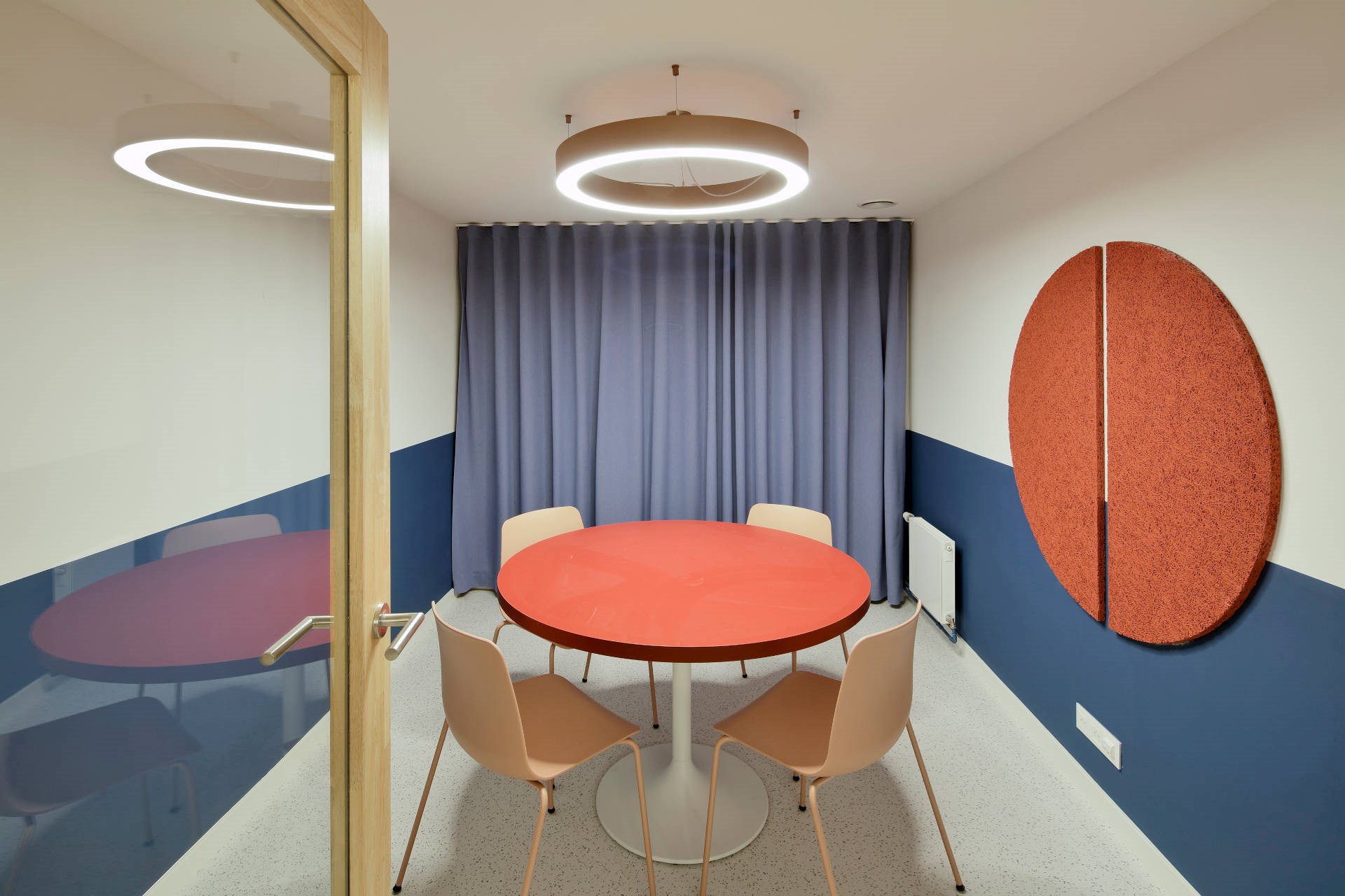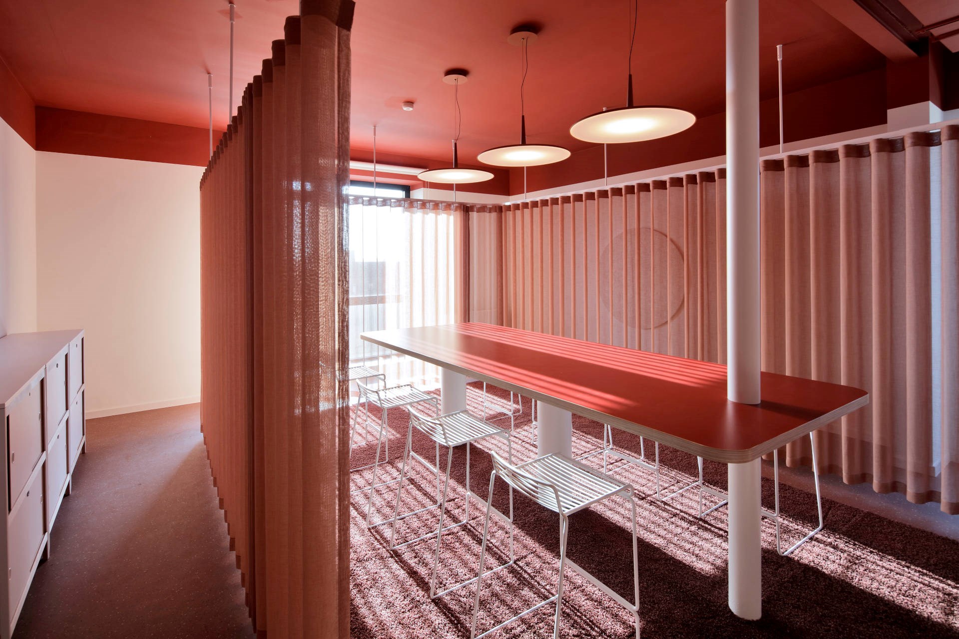 À l'intérieur, UMAN Architect a complètement repensé l'espace pour répondre aux exigences d'un milieu professionnel moderne. Le centre offre maintenant cinquante postes de travail modulables, des espaces de réunion, des zones communes, et une salle de traduction, tous conçus pour encourager l'échange et la collaboration.