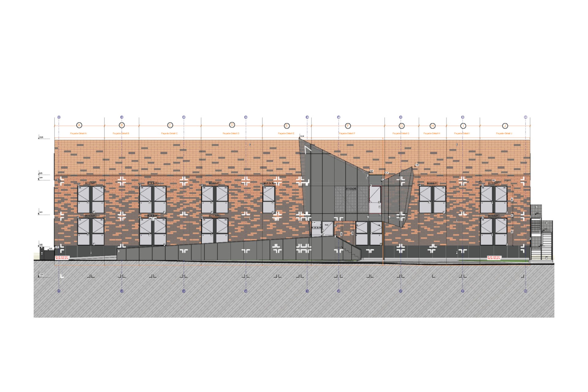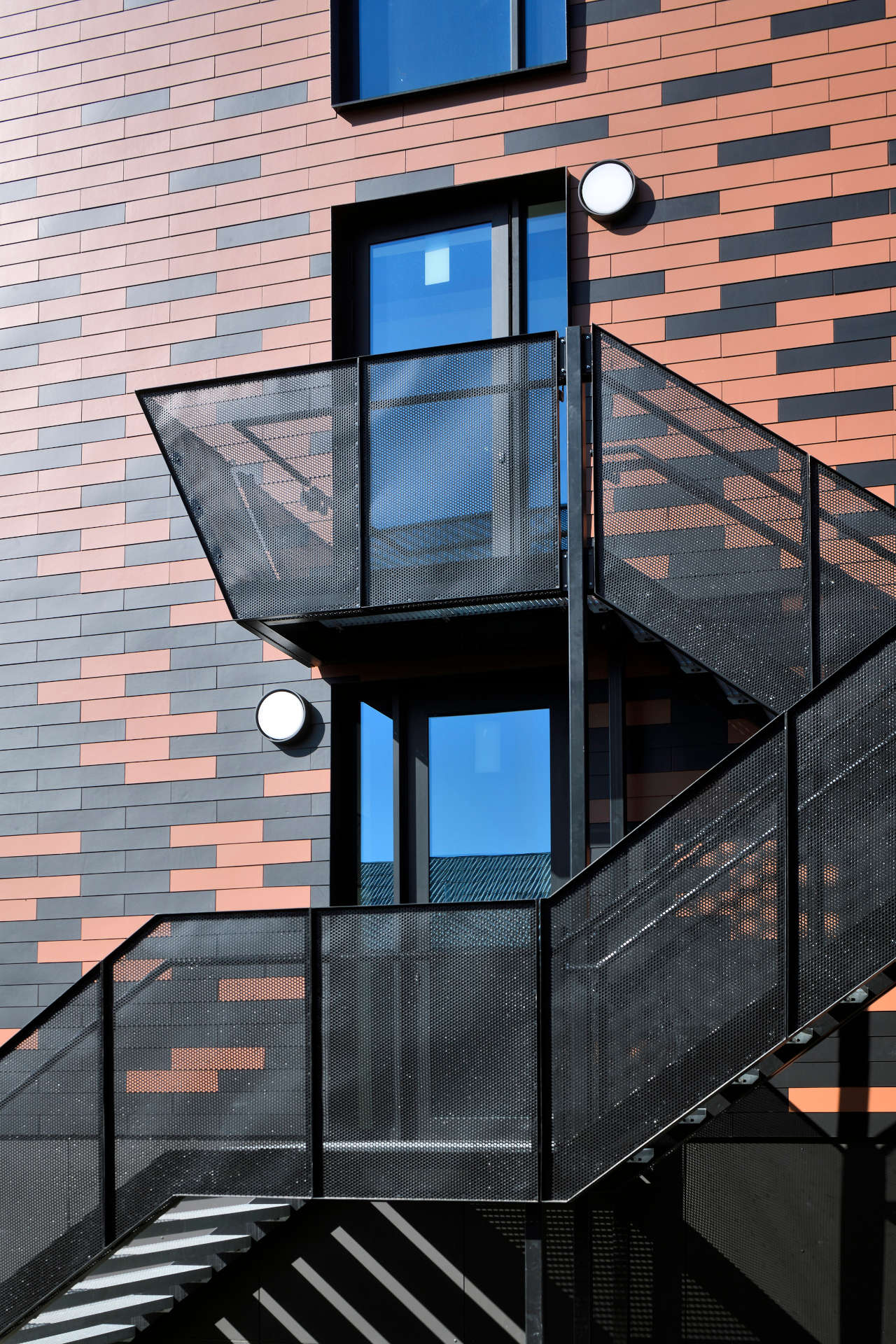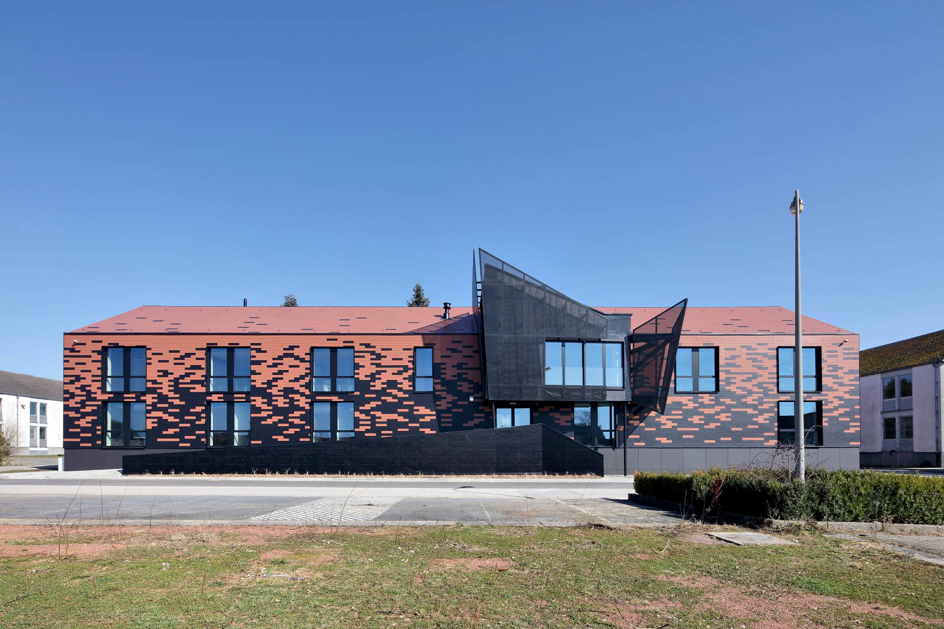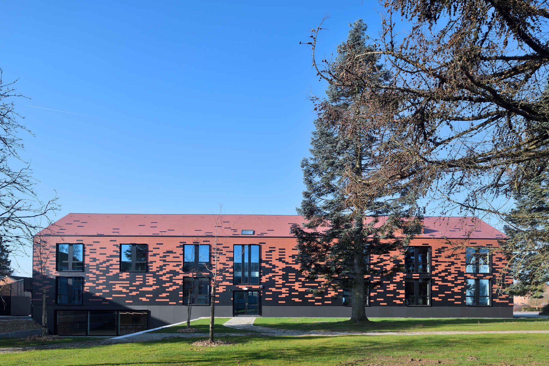 Le projet de réaffectation s'est concentré sur la préservation de l'empreinte historique tout en l'adaptant aux besoins contemporains. Les façades et les toitures du bâtiment, étendu sur 1.200 m² répartis sur deux étages et un sous-sol semi-enterré, ont été rénovées avec des bardages en terre cuite. Cette finition utilise un dégradé de noir à rouge, écho subtil à la brique pillée du parade-ground situé en face, renforçant ainsi le dialogue entre le nouveau centre et son environnement chargé de mémoire.