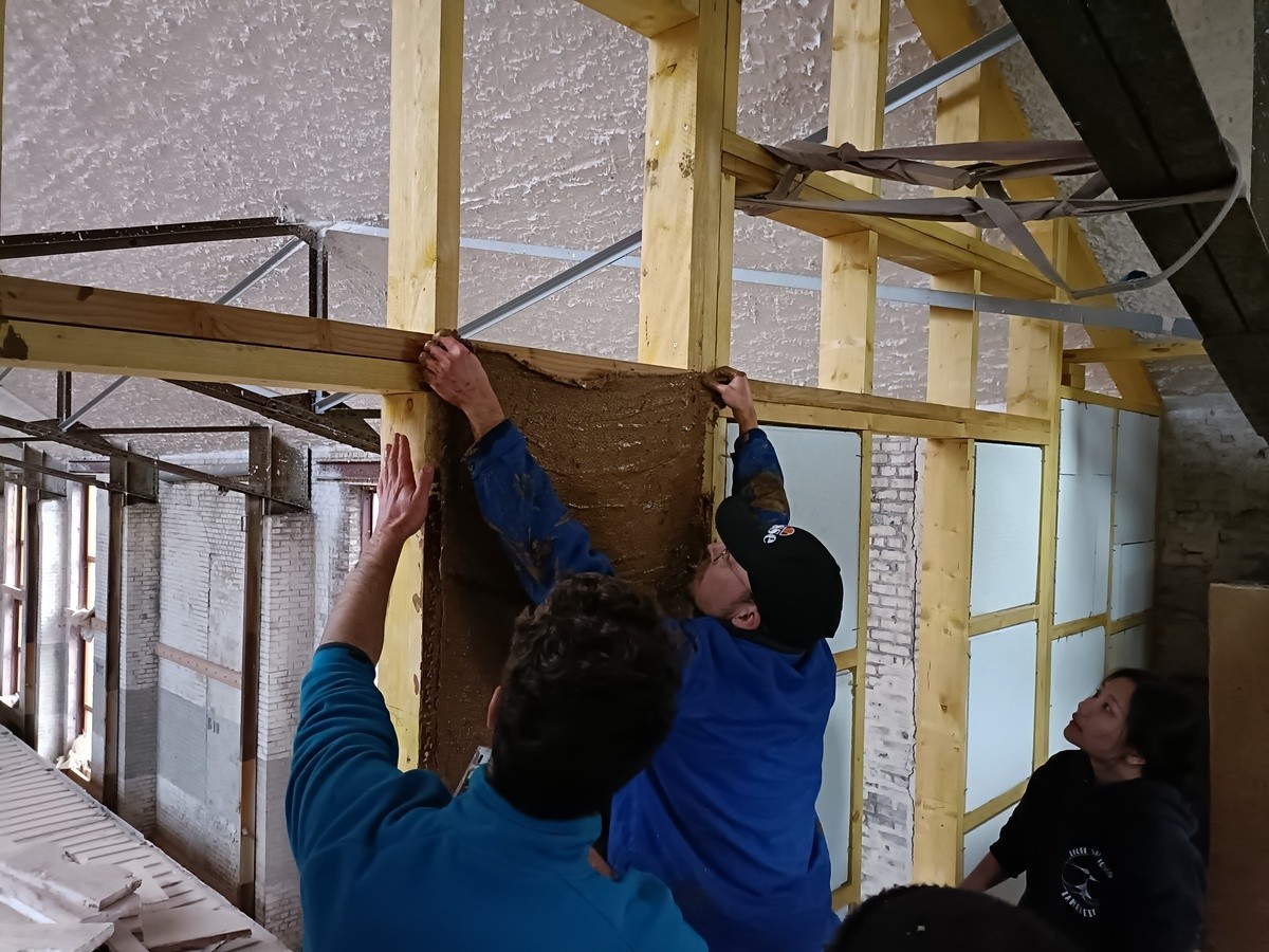 On pourrait penser à une blague, mais des cheveux humains, récupérés chez un coiffeur local, ont également servis comme matériel de construction. Ils entrent dans la composition des cloisons intérieures et de l’enduit utilisé pour de finition de celles-ci, mélangés, entre autres, avec de terre (d’excavation provenant du Havre) et du carton broyé (provenant de déchets du Hangar Zéro) et des sacs de jutes.