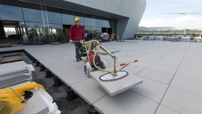Afin de répartir la pression de manière optimale sur la toiture et avoir une surface nivelée, Zoontjens a posé ces tuiles sur le système DNS®Large. Le système, un plot composé d’un large disque à la base et d’un tube DNS® réglable sur lequel repose le disque support,permet de bien stabiliser et de fixer les dalles.