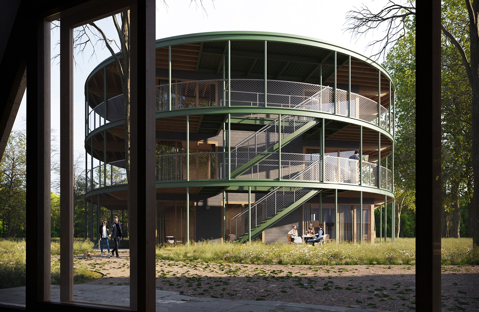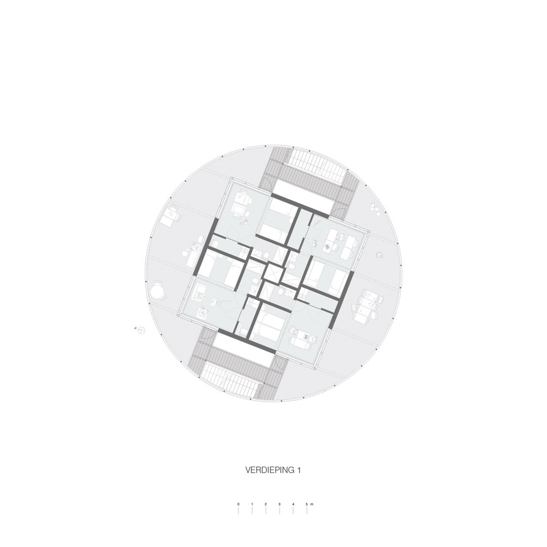Un appel d'offres a été lancé et le contrat a finalement été attribué à U/Define, basé à Bruges, et à Frantzen et al architecten, d'Amsterdam, qui ont collaboré avec le Gantois Aldrik Heirman pour l'aménagement paysager, qui faisait également partie du cahier des charges. Le bâtiment conçu par U/Define et Frantzen et al architecten se distingue par sa forme ronde et comprend neuf unités résidentielles pour un total de 26 personnes réparties sur deux étages, avec aussi une cuisine et un salon communs au rez-de-chaussée.