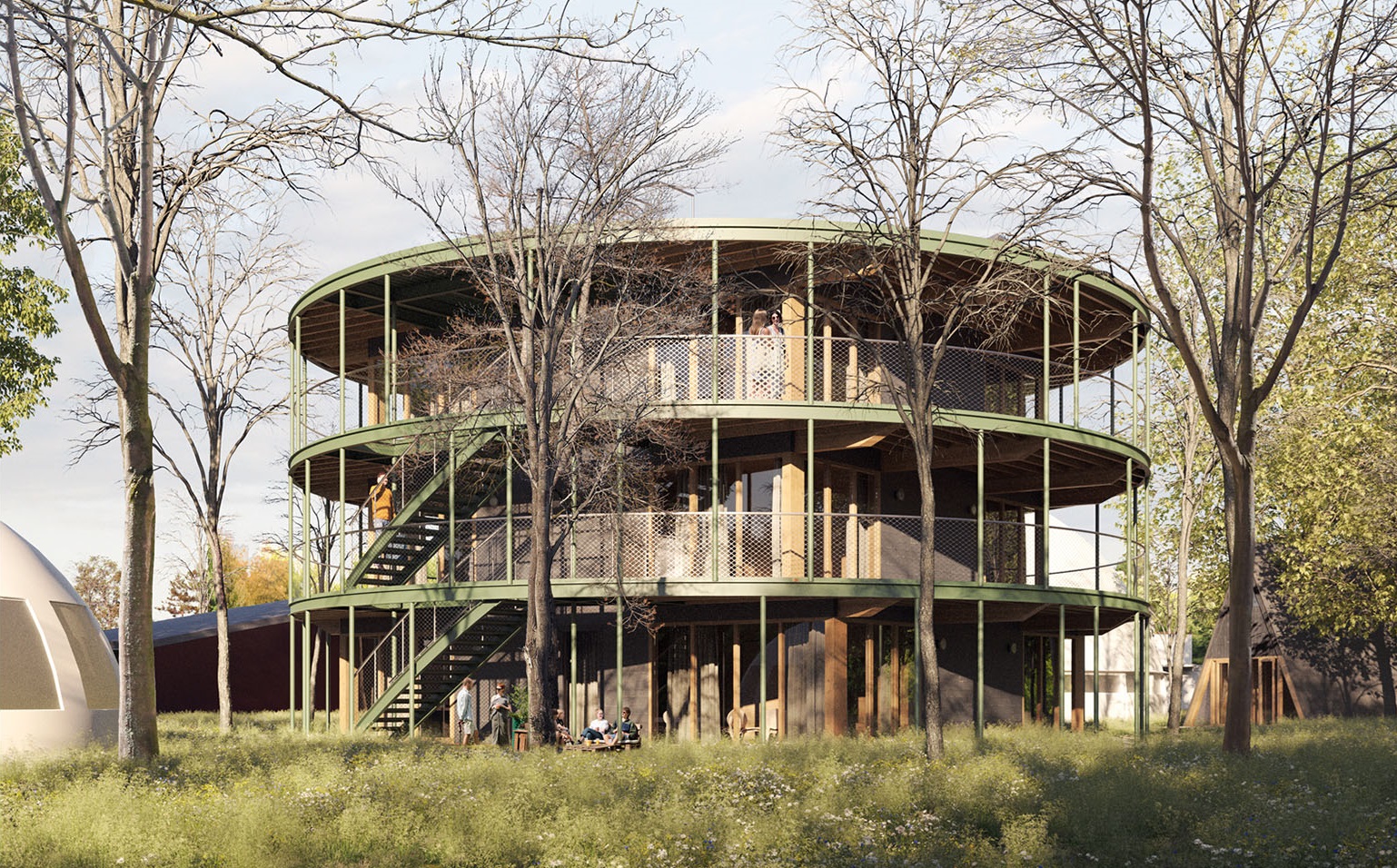 Un chemin sinueux relie le nouveau volume circulaire aux quatre bâtiments circulaires plus petits qui se trouvent déjà sur le site du Centre Frans Masereel. De nouvelles plantations et un réaménagement de l'espace vert existant créeront de nouveaux coins d'ombre et de détente accessibles depuis la cuisine et l'espace de vie communs du nouveau bâtiment.