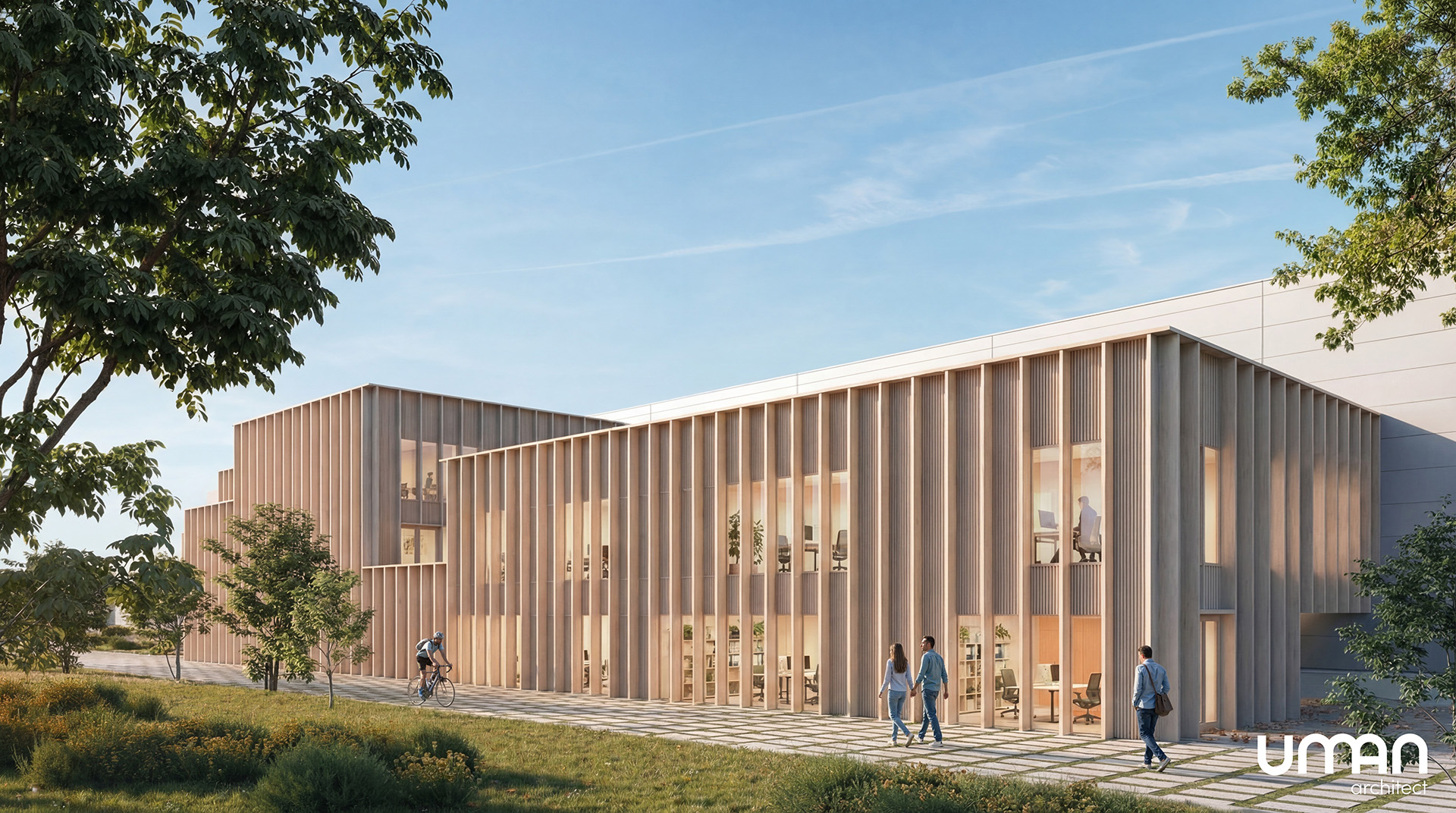 Les halls sont dimensionnés pour accueillir une production modulaire évolutive. Les bureaux privilégient l’apport de lumière naturelle et intègrent des espaces partagés. L’organisation vise à structurer les flux entre les différentes fonctions du site tout en assurant des conditions de travail adaptées aux utilisateurs. Le projet met ainsi en relation exigences de production et qualité des espaces de travail.
