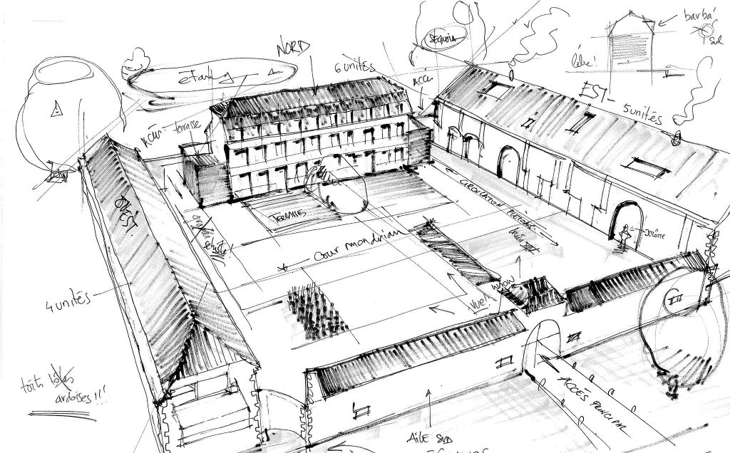 L’aile Nord, anciennement double corps de logis des maîtres, est désormais composée de 6 unités d’habitation. « Chaque entité profite de la façade sud de l’aile pour recevoir un maximum de luminosité », précisent les architectes. « L’entrée contemporaine, avec sa rampe et sa partie couverte ajoute une touche élégante à la façade préservée. » L’aile Ouest, où se trouvaient les anciennes étables, est composée de 4 appartements. « Sa reconversion est la plus marquée du site, par les modifications des niveaux mais aussi par les percements gigantesques coté parc. » Enfin, l’aile Est, constituée d’anciennes granges de toute beauté, est l’aile la plus imposante du château. Elle est aujourd’hui composée de 5 maisons.