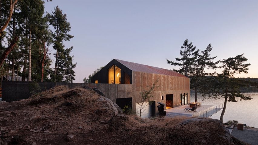 Du bois de récupération et de l'acier Corten ont été utilisés pour créer une maison au bord de l'eau sur une île de la Colombie-Britannique. Cette maison, qui appartient au fondateur de Measured Architecture, Clinton Cuddington, qui travaille souvent à distance depuis la maison et y passe ses vacances. Surtout, il l'a conçue pour explorer une « approche zéro » de la conception et de la construction.