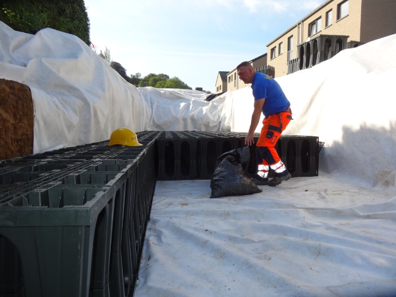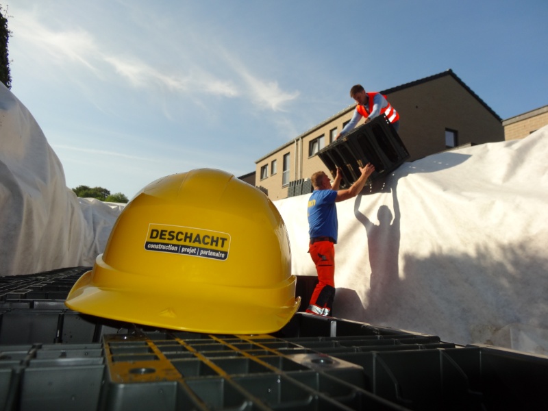 C’est là que les caissons d’infiltration et de rétention IT-Plus® Columnbox en polyéthylène de Deschacht se sont avérés indispensables. Outre leur taille réduite et leur forme spécifique qui permet aux entrepreneurs de les empiler et d’en charger davantage sur les camions, ce qui génère de substantielles économies de transport, les caissons Columnbox ont beaucoup d’autres avantages. Vincent Brehl, Conseiller technico-commercial chez Deschacht, en parle mieux que quiconque : « Tout d’abord leur modularité, qui permet de les installer quel que soit l’espace disponible. Puis leur légèreté, avec environ 3 kg par bloc. Il y a aussi le fait que notre filiale Collinet fabrique pour ces caissons les chambres de filtration et de régulation, mais aussi les connexions et les pièces spéciales, qui sont donc toujours en stock. Et, enfin, il y a la rapidité de mise en œuvre. »