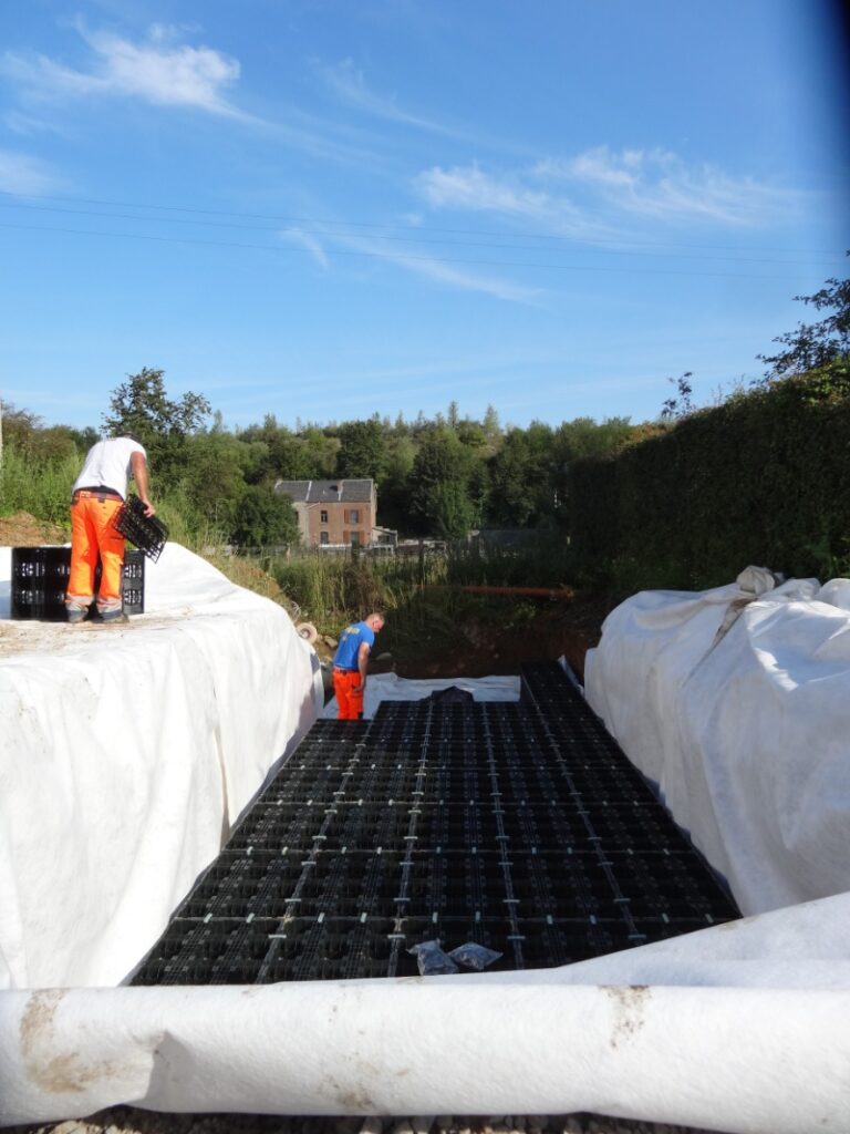 Nous sommes à Sprimont, en région liégeoise. Là où, afin de répondre aux impositions de la commune, il était nécessaire d’installer un bassin d’orage d’infiltration pour recueillir les eaux de voirie d’un tout nouveau lotissement de 6 maisons unifamiliales. L’occasion pour Deschacht de montrer toute l’étendue des nombreuses qualités de ses caissons d’infiltration et de rétention Columnbox.