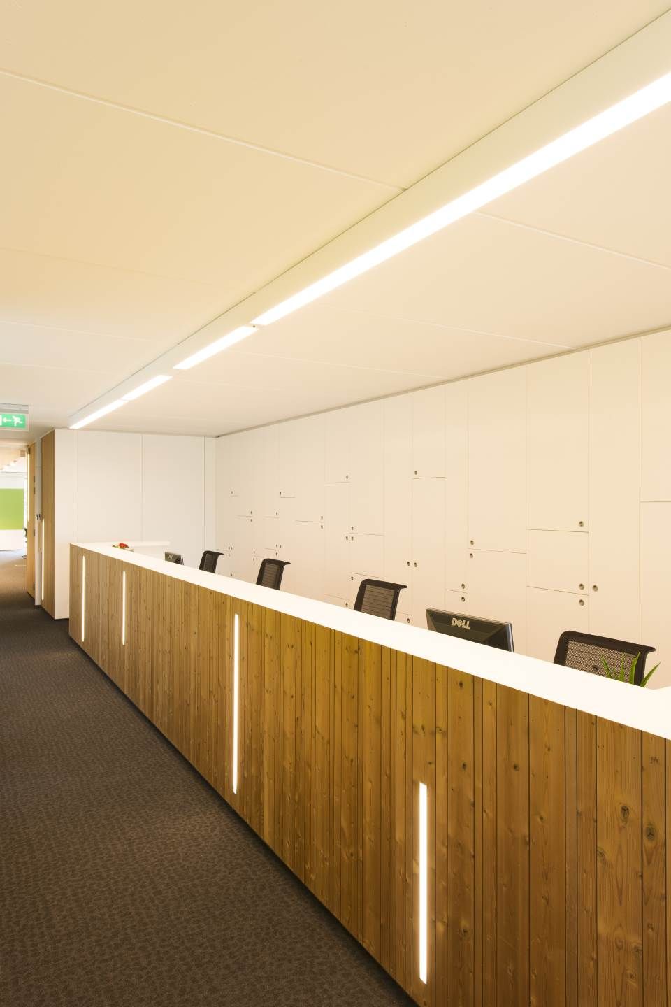 Avec son nouveau bâtiment, le maître d’ouvrage souhaitait avoir quelque chose à montrer. Le toit n’est ainsi pas un simple toit, mais est rendu accessible pour former l’une des cartes de visite de l’entreprise. Une terrasse en bois labellisé FSC et une toiture végétalisée habillent le lieu. La toiture verte (en partie extensive, en partie pourvue d’un substrat intensif) retient l’eau de pluie, combat le risque de surchauffe, absorbe les particules fines et favorise la biodiversité. Grâce au système Sun Roof d’Optigroen, la toiture verte sert également de ballast pour les panneaux solaires. Les systèmes solaires fournissent de l’énergie renouvelable, ont un but démonstratif et participent à une campagne de mesures. Dix Econation Lightcatchers (une technologie couronnée à plusieurs reprises) sur le toit de l’entrepôt suivent activement le soleil et maximalisent l’apport de lumière naturelle.