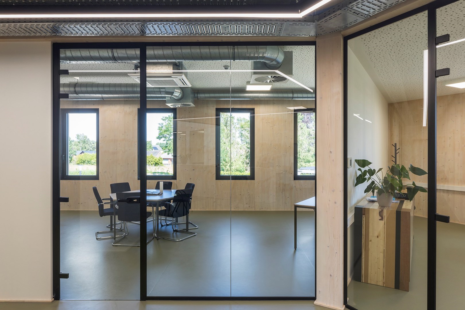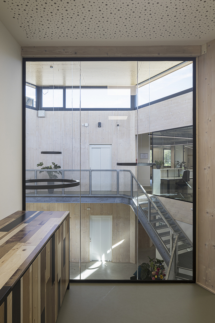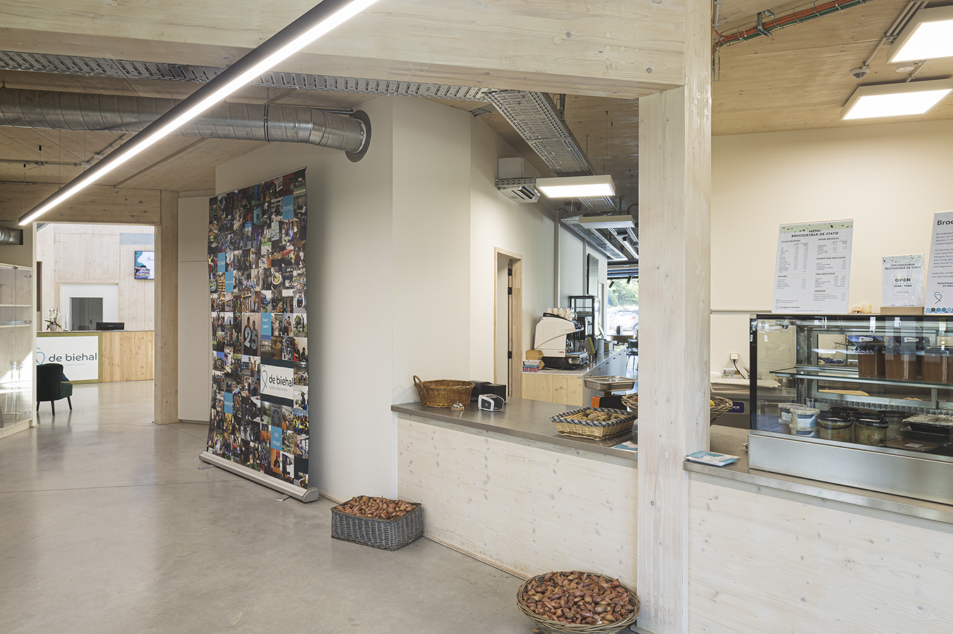 On peut aisément avancer que le nouveau bâtiment de l'asbl de Biehal est un exemple de construction circulaire rigoureuse. En effet, l'ensemble de la structure se compose de CLT et de bois lamellé-collé (aussi appelé glulam). Ce matériau structurel sert également de matériau de finition. L'ensemble de la structure en CLT a été assemblé avec des connexions réversibles, par analogie avec toutes les autres connexions du bâtiment.