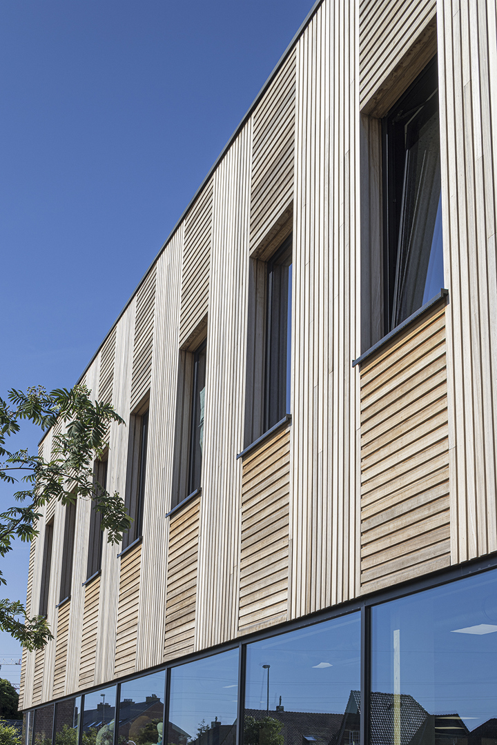 Pour les finitions de la façade, directement fixées à la structure CLT, le choix s'est porté sur des cassettes préfabriquées, remplies d'une isolant en flocons de cellulose - à base de journaux recyclés - et d'une finition en bois Thermowood, une alternative écologique au bois dur tropical, dans la mesure où le bois provient de conifères issus de forêts européennes gérées de manière durable. Tous les matériaux de finition sont également aussi bio-écologiques que possible.