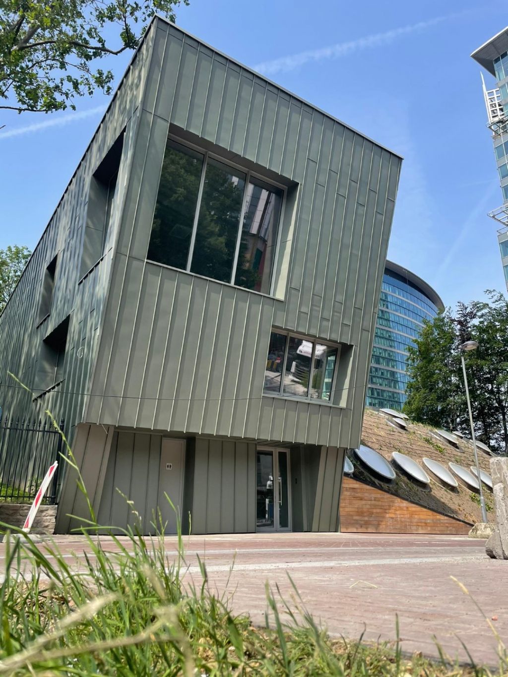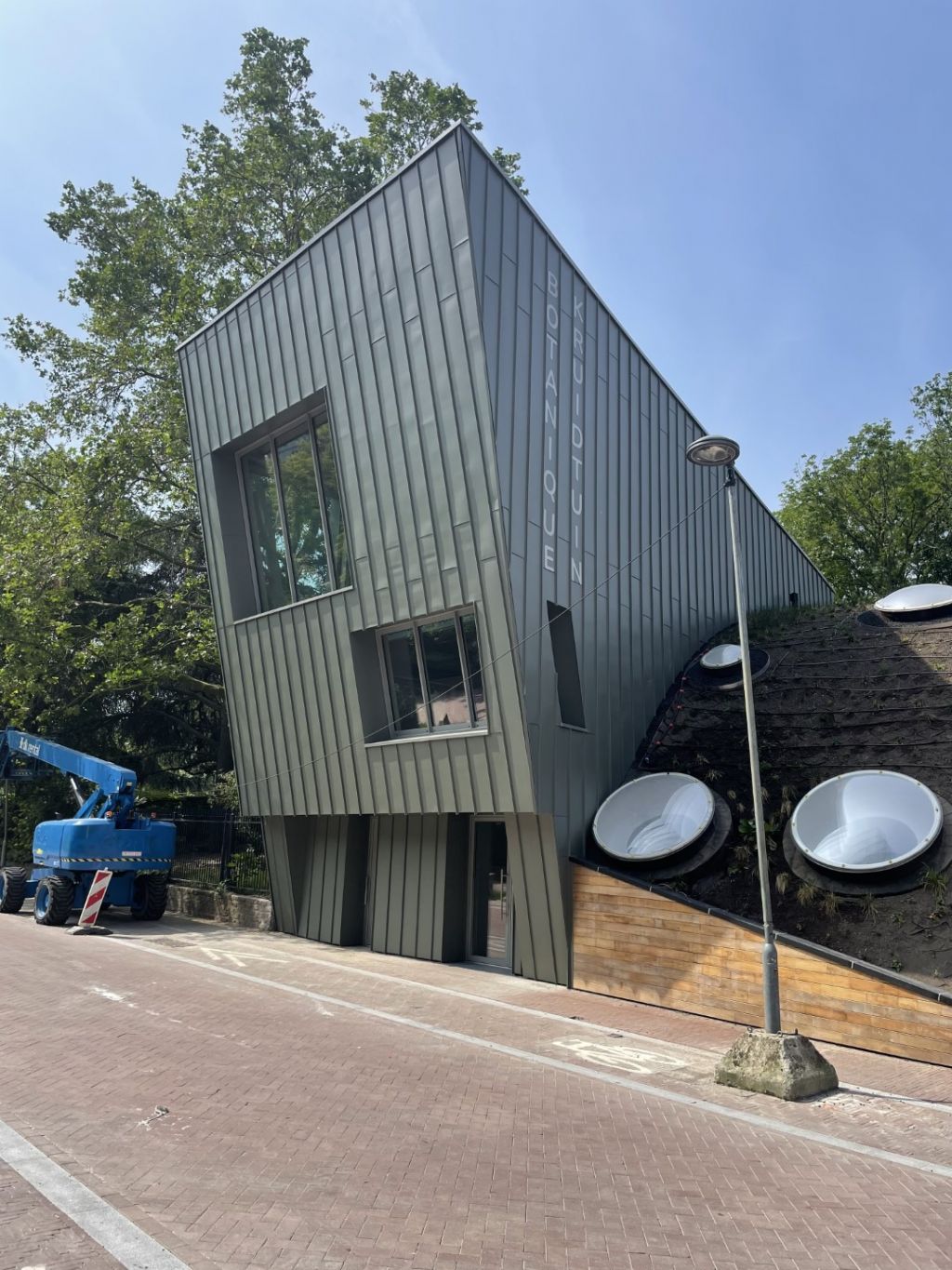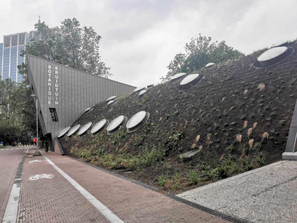 L’architecture marquante, que l'on doit au bureau ARTER architects en association avec le bureau d'études Ellyps, s’intègre au paysage du parc avec une toiture verte courbe rappelant la forme d’un talus, des façades avec un bardage en bois et une tour dont le parement en zinc vert rappelle le dôme de l'Orangerie du Jardin Botanique à côté.