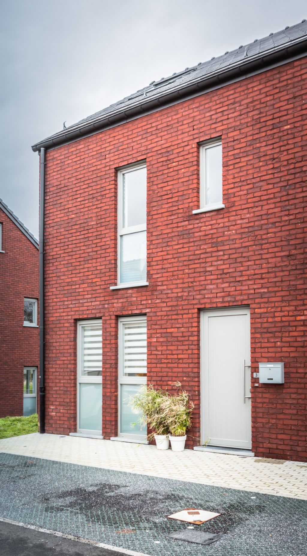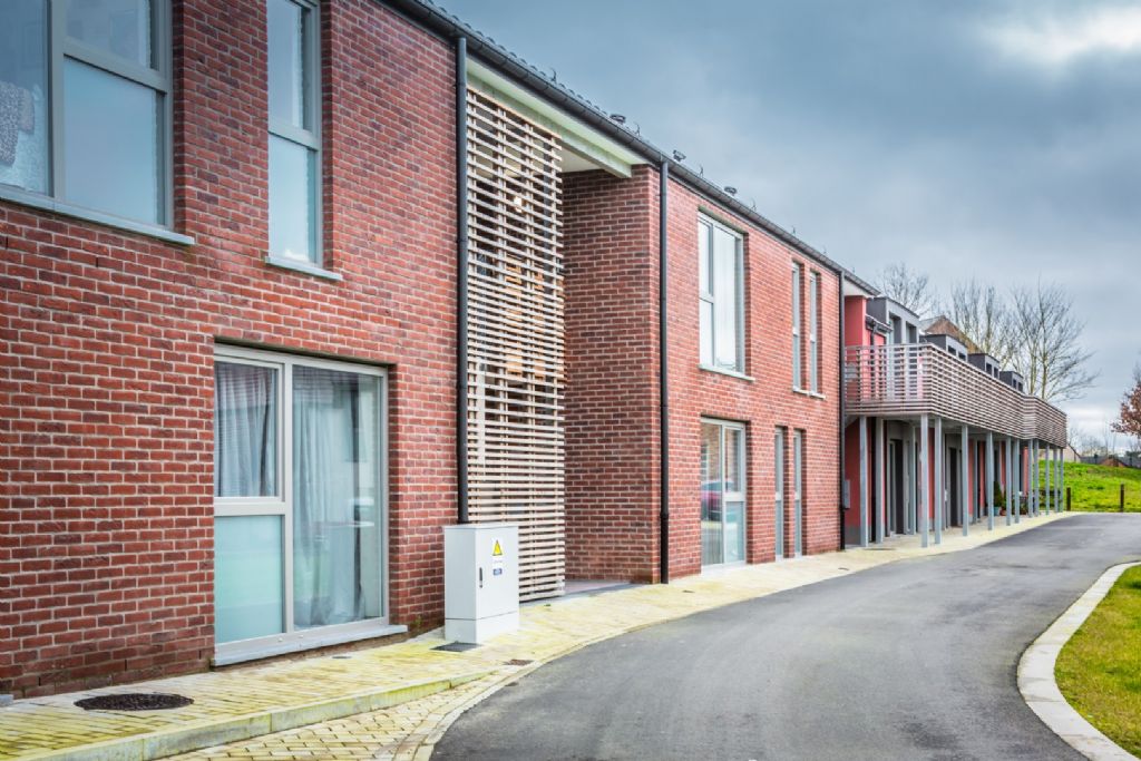 Par souci d’intégration au contexte bâti existant, les gabarits et volumétrie restent dans la droite ligne du logement traditionnel rural. Par contre, les façades ont été conçues de manière plus contemporaine. « La maîtrise d’un budget serré a mené à des choix sobres et raisonnés en matière d’esthétique », précise l’architecte. « Nous nous sommes donc limités à deux matériaux de parement, déclinés en deux tonalités uniquement : rouge foncé pour la brique et blanc cassé ou rouge pour l’enduit, en référence au cadre bâti dominant à Walhain. Grâce au choix de deux teintes de joints de parement, une sobre diversité est introduite dans les développés des façades des ensembles. De la même façon, la limitation volontaire à trois types de dimensions de baies, exprimant la fonction de l’espace correspondant, a permis une composition des façades reflétant le même esprit qui est porteuse d’unité pour le quartier. »