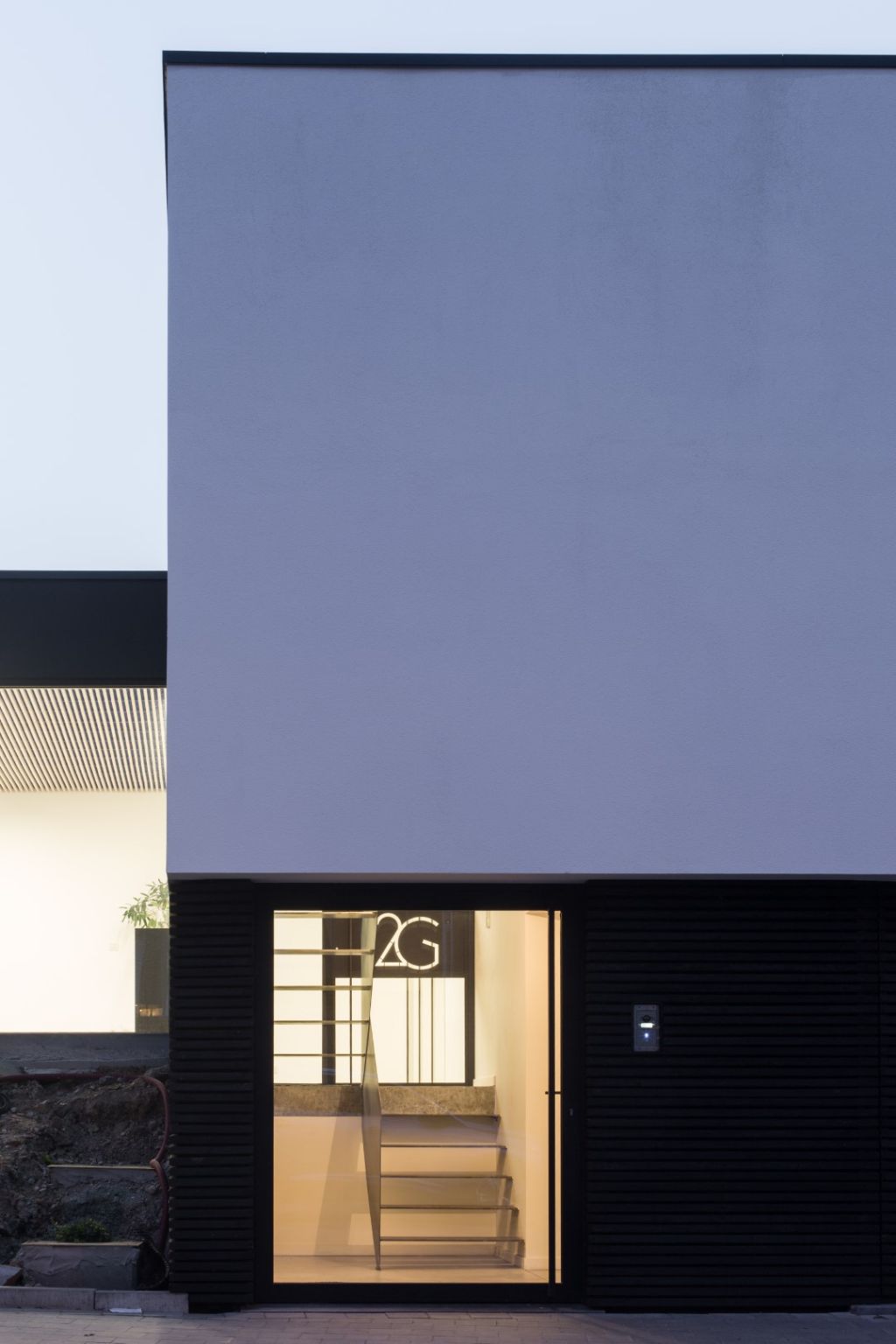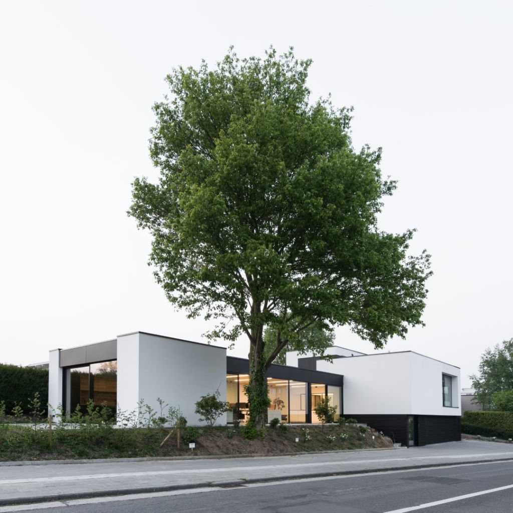 Quant aux façades, « notre volonté était de marquer les différents volumes et fonctions rencontrées dans le projet. Il est donc fait usage d’enduit blanc, de bardage en panneaux noirs et d’un bardage en bois brûlé pour habiller le volume du garage en intégrant la porte de celui-ci. »