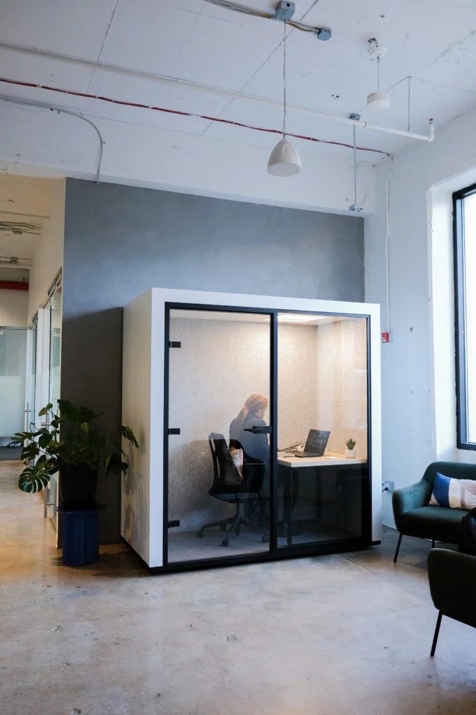 Finalement, JUUNOO a apporté la solution avec une cabine d'appel sur mesure qui s'intègre parfaitement à l'intérieur et répond aux dernières exigences en matière d'acoustique et d'innovation. JUUNOO estime que cette cabine est un mélange parfait de silence, de confort et de style, dans lequel les professionnels peuvent donner libre cours à leur productivité. Et ce, au milieu de l'agitation d'un espace de coworking.