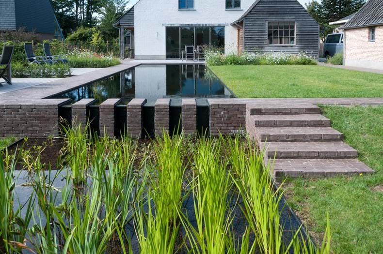 J'affectionne particulièrement les pavés en terre cuite de Vande Moortel pour leurs nuances subtiles. » Grâce à diverses ouvertures rythmiques dans le mur de soutènement, l'eau s'écoule de l'étang de baignade dans la partie de filtration située en contrebas en autant de petites chutes d'eau.