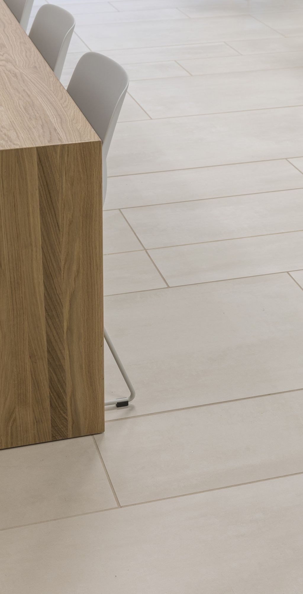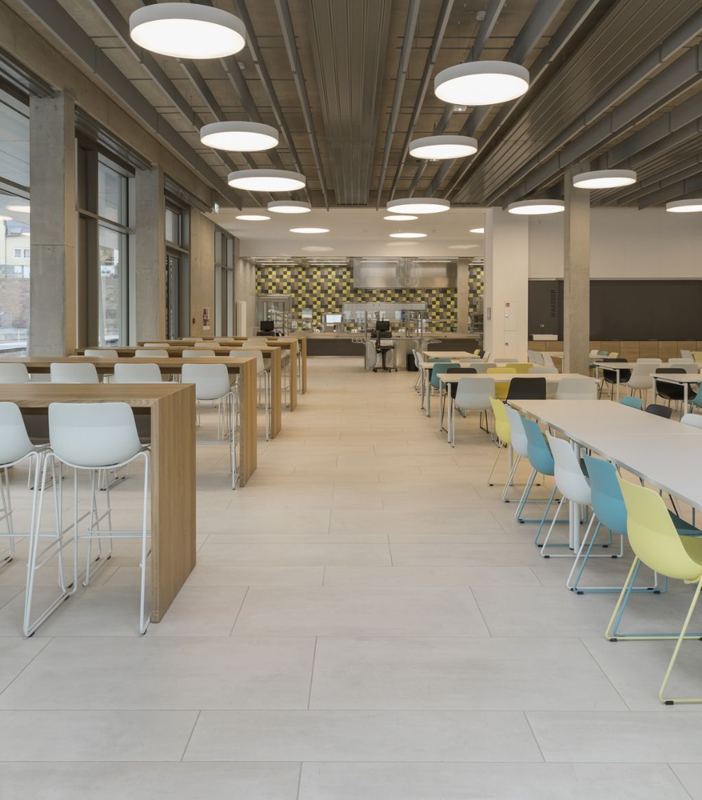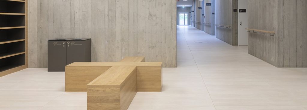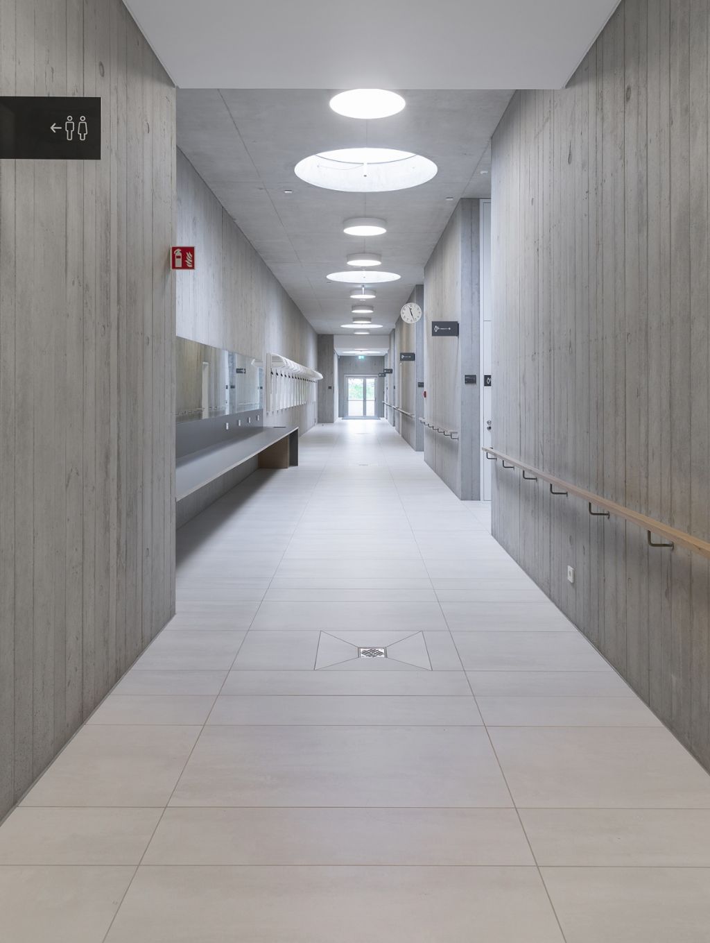 Toutes les pièces ont été équipées de revêtements de sol adaptés en fonction de leurs exigences et besoins spécifiques. Si les salles de classe ont été dotées de parquet, le revêtement de sol des classes de sciences devait répondre à des propriétés spécifiques, notamment une résistance aux produits chimiques. C’est ainsi qu’il a été opté pour des carreaux en céramique de la collection Terra Beige & Brown de Mosa. Les carreaux ont été posés en bandes, avec des joints longitudinaux et transversaux alignés. Les mêmes carreaux beiges et gris clair ont été également utilisés – dans des formats, versions (lisse/relief) et schémas de pose divers – entre autres dans la piscine, le vestiaire et le restaurant.