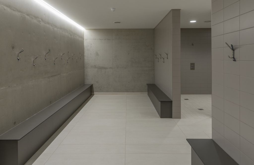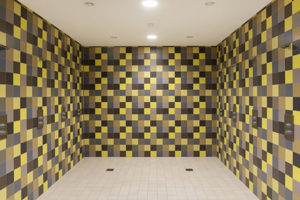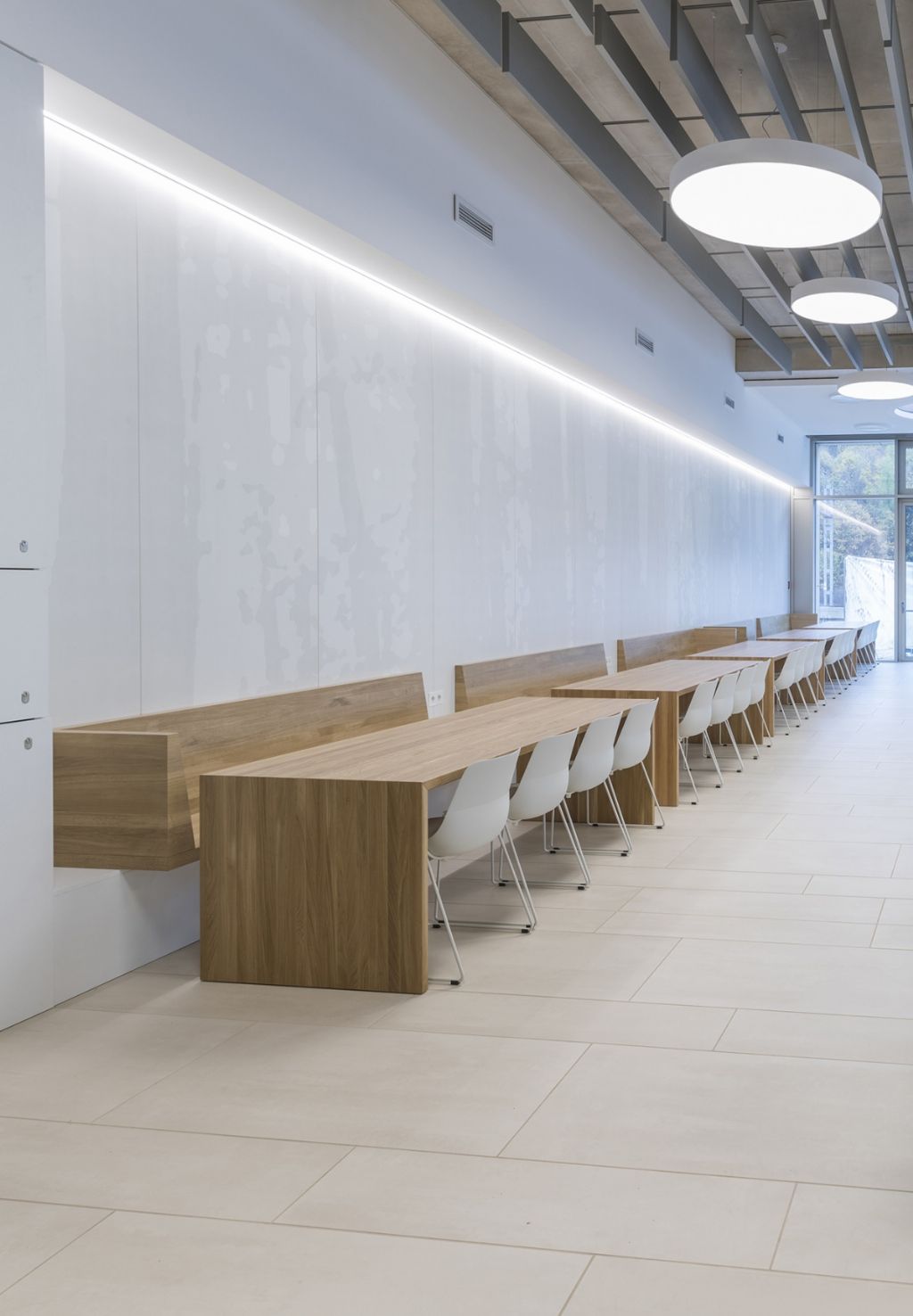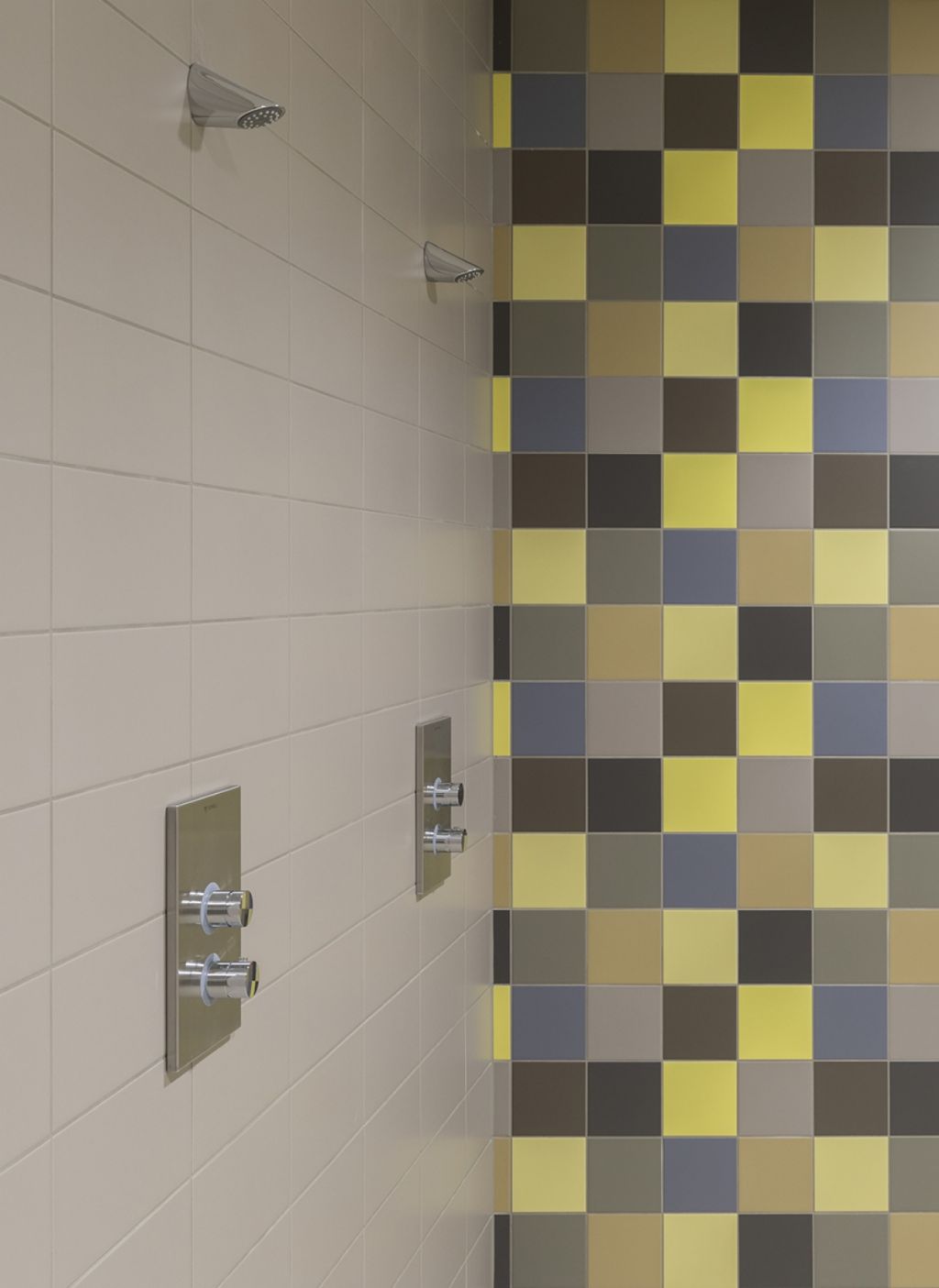 Outre le carrelage au sol, on retrouve également des carreaux Mosa dans neuf coloris différents (Mosa Murals) sur les murs des sanitaires, des douches et du self-service. Les faïences affichent un dessin original qui contraste avec les tons naturels des matériaux bruts utilisés à l’intérieur, notamment les bétons apparents lisses et en planchettes, le terrazzo et les parquets chêne huilé.