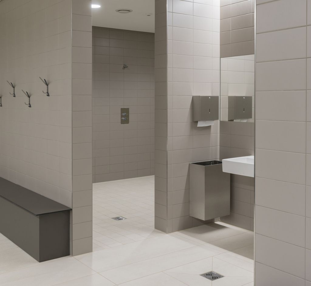 Une école avec tant de fonctions différentes demande une attention particulière sur le choix du revêtement de sol. En raison de ses qualités, le carrelage Mosa a été choisi pour tous les lieux qui demandent des caractéristiques spécifiques: piscine, vestiaires, salles de douche, classes de sciences, restaurant et ateliers. Corinne Stephany : « Nous avons opté pour un carreau de sol de la série Terra Beige & Brown, de couleur gris-beige clair (262) et en grands formats (30 x 120 et 60 x 120 centimètres). Dans les salles de douche, nous l'avons mis en œuvre en petit format (15 x 15 centimètres). Nous recherchions un carrelage qui puisse affronter les différentes situations que l’on trouve dans l’école. Il était aussi important pour nous qu’en plus des qualités techniques du carrelage – par exemple, une variante antidérapante autour de la piscine – celui-ci ait également une valeur esthétique car nous voulions reproduire la même ambiance conviviale dans la totalité du bâtiment. Chez Mosa, nous avons trouvé le même produit – avec la même méthode de pose, les mêmes joints et la même couleur – dans différentes versions (degré de rugosité). » La modularité exceptionnelle des carreaux permet d'étendre les joints du sol au mur. Et avec leurs bords arrondis, les plinthes à gorges fines vont assurément faciliter l'entretien quotidien. « Pour répondre à nos exigences élevées, Mosa a procédé à une production sur mesure pour le carrelage grand format de la piscine. Il faut dire qu’il n’existe pas beaucoup de producteurs qui disposent d’une pareille offre et sont néanmoins prêts à rechercher des solutions individuelles. La proximité de Mosa a été sans aucun doute un grand avantage. »