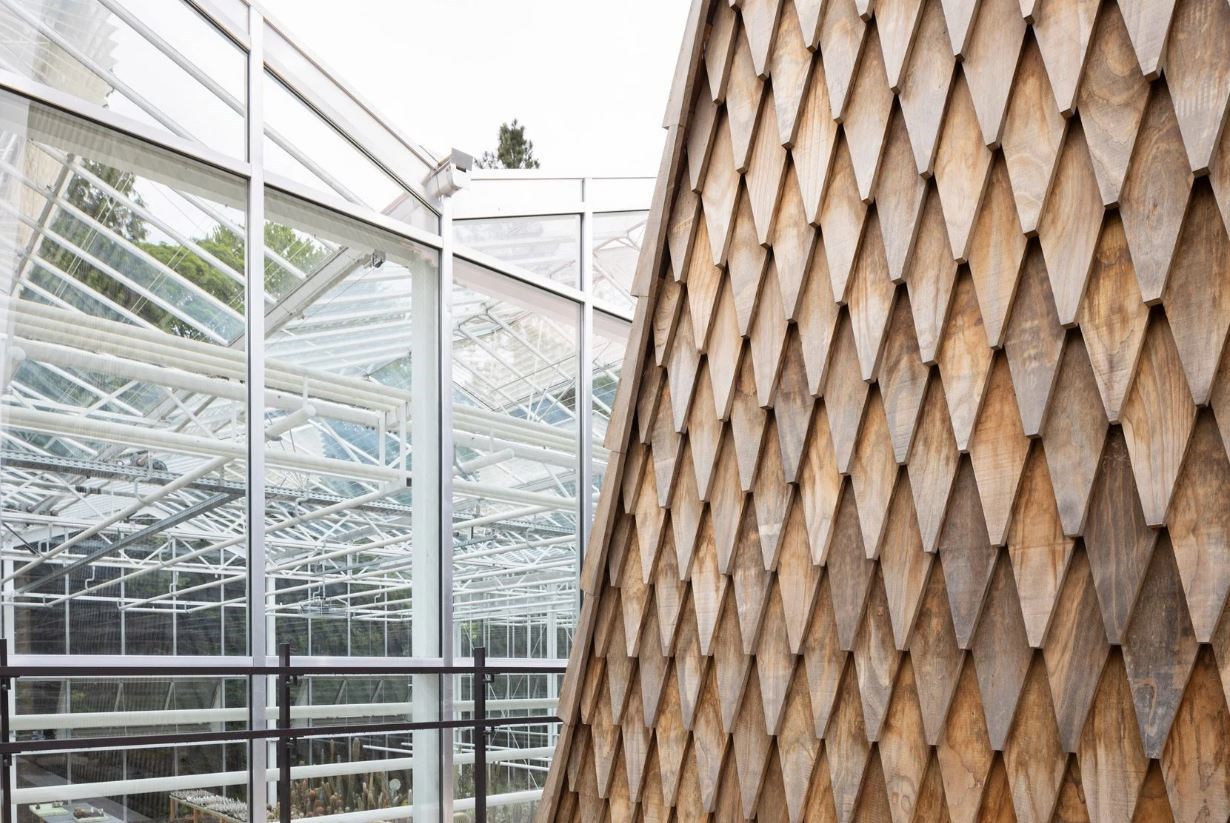 Le reste de l'Arche Verte est abrité sous un toit en béton qui sert également de terrasse. Cette terrasse offre aux visiteurs des vues sur les niveaux supérieurs des serres et sur les arbres environnants. Du centre de cette terrasse en béton émerge le toit voûté, qui est recouvert à l'extérieur de bardeaux en bois de Kebony, créés à partir de bois de récupération provenant d'autres projets du studio.