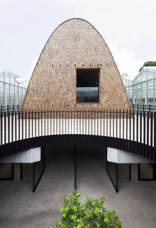 « Le pavillon est niché dans une mer de serres présentant des zones climatiques du monde entier », a expliqué NU Architectuuratelier dans une déclaration à Dezeen. « C’est le trésor de plantes vivantes et de graines que le pavillon dévoile visuellement au public. »