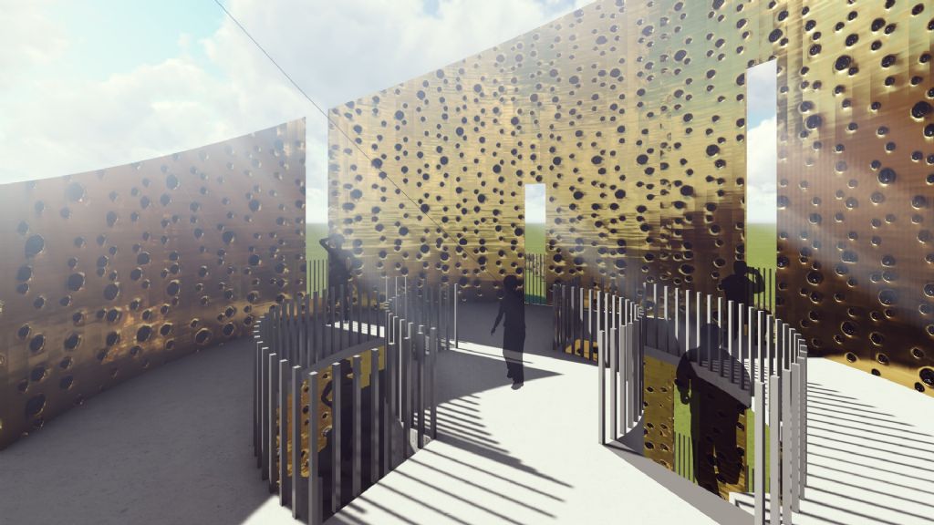 « Quant à la partie supérieure, nous n'en fermons pas l'enveloppe .Nous allons créer trois plateaux en réduisant la surface de 200 à environ 50 mètres carrés exploitables par plateau. Ceux-ci seront extérieurs, ouvrant des points de vue sur le paysage. Un bureau d'études est à l'oeuvre actuellement, notamment pour calculer la prise au vent, importante à cette hauteur. L'idée est de travailler avec un bardage métallique ajouré, avec des perforations de diamètres variables, de manière à garantir au visiteur une certaine transparence vers le paysage. A certains endroit, nous allons créer des ouvertures verticales offrant des points de vue spécifiques sur le paysage de la Famenne. Cette peau métallique a de nombreux avantages : une perméabilité réduisant la prise au vent, une perméabilité visuelle également, une fonction garde-corps et enfin la possibilité de créer un jeu de lumières la nuit, grâce à un rétro-éclairage de l'intérieur. »