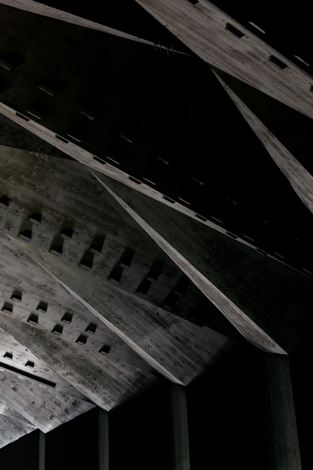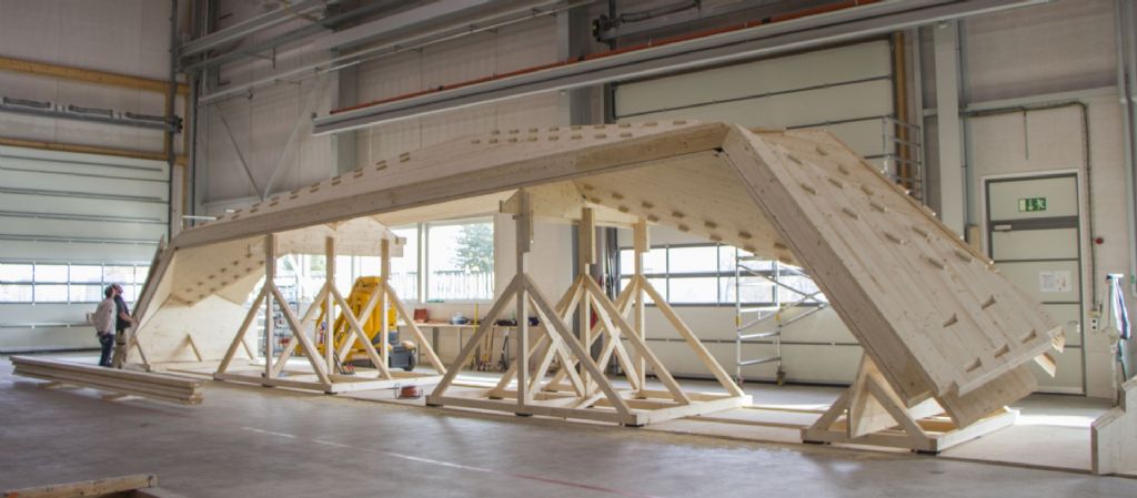 Les recherches de l’IBOIS appliquées au Pavillon ont permis d’élaborer une structure porteuse qui peut s’étirer sur une distance de 16 à 20 m sans pilier et avec une épaisseur de panneau de seulement 45 mm. La distance entre les deux couches est de 300 mm à partir du haut du panneau extérieur et jusqu’au bas du panneau intérieur. L’espace creux d’une profondeur de 210 mm accueille l’isolation qui est réalisée en ouate de cellulose, la fibre naturelle du bois, obtenue à partir de papier journal recyclé et soufflée entre les deux couches des panneaux de bois constituant la structure.