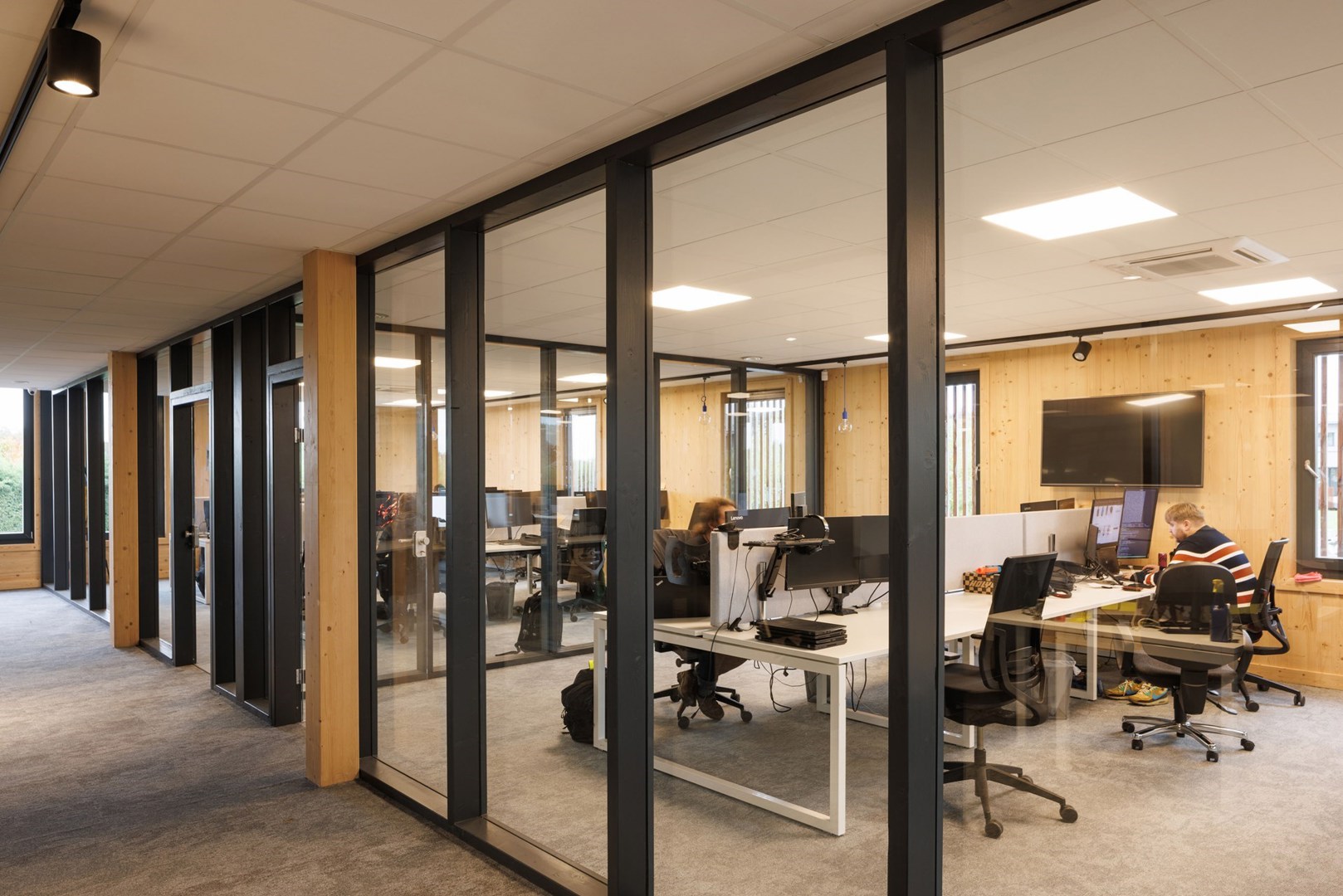 Construit à Suarlée, dans le zoning Ecolys, le bâtiment abrite une entreprise IT wallonne qui occupe 22 collaborateurs. Le bureau d’architecture Esquisse est situé à Andenne à quelques encablures, et le fabricant et constructeur bois Stabilame est à Mariembourg. Les châssis et murs intérieurs vitrés sont également fabriqués à Mariembourg, à la Menuiserie Riche. Le rayon d’action principal des éléments constructifs est donc de 85 km, ce qui constitue des circuits courts, et permet d’intégrer la notion de Made in Belgium….