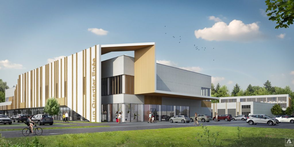 « Un Quartier Enée » se singularise par des volumes et gabarits clairs et rigoureux, tant dans la partie commerciale que celle réservée à l’espace des entreprises et bureaux. Un jeu d’auvents et de coursives couvertes permet la protection des chalands, guident les flux de circulation et crée un lien entre les différentes fonctions présentes sur le site. Les volumes principaux et gabarits simples sont en béton ; les volumes secondaires, habillages (auvent, enseignes, circulation verticale…) et détails (encadrement de baies, garde-corps…) sont travaillés et de teinte claire et décor bois.