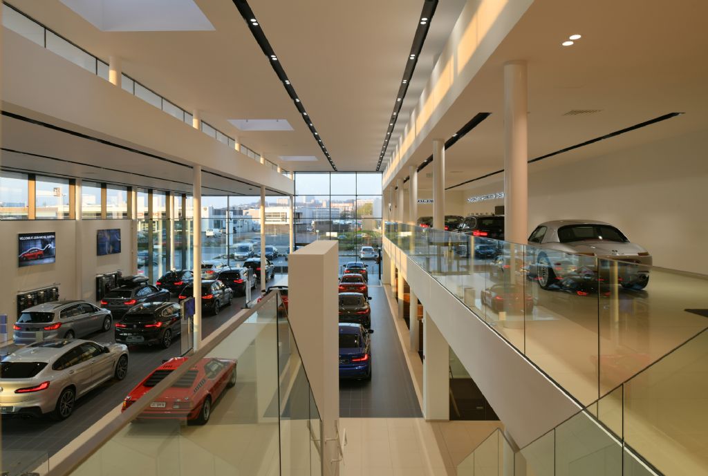 La nouvelle construction, ultra-contemporaine, propose un showroom sur 2 étages où la luminosité est l’élément clé. De larges baies vitrées permettent au bâtiment de s’intégrer parfaitement dans son contexte urbain et offrent une expérience innovante aux visiteurs. La mezzanine est accessible aux véhicules via un ascenseur pour voiture qui se trouve dans l’atelier.
