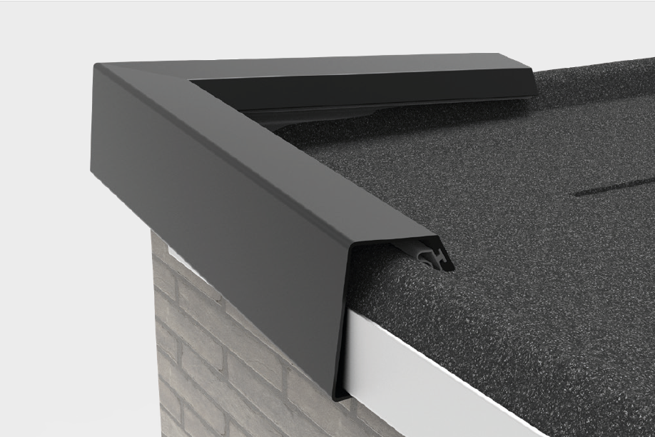 Le système de rive de toit Roofing Clips se compose de deux parties : un profilé de base et une garniture. Le profilé de base permet de réaliser une finition étanche du bord de la toiture, sans qu'il soit nécessaire de brûler le bitume jusqu'au bord de la toiture. La moulure peut ensuite être clipsée sur le profilé de base dans la couleur souhaitée. Un avantage supplémentaire de cette configuration en 2 parties est qu'elle intègre parfaitement phénomène de rétraction de l'aluminium, sans intervention supplémentaire.