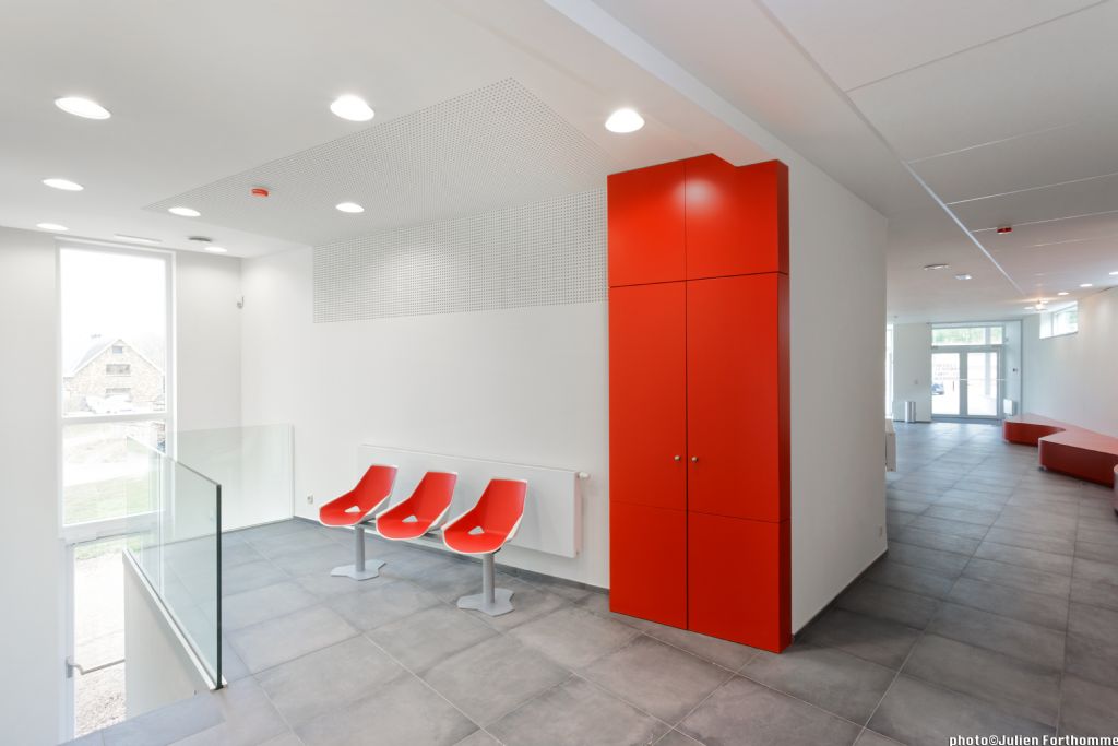 L’entrée à la polyclinique est marquée de manière physique par l’angle du mur et par un travail au niveau des éclairages. Les différents logements profitent d’une entrée plus intime via le patio intérieur du bâtiment. Les espaces intérieures ont été étudié afin de répondre aux besoins des utilisateurs tout en proposant un design novateur et performant. Dans la polyclinique, les fonctions administratives et opérationnelles sont gérées de manière différentes, tout comme les espaces de vie commune et quotidienne du personnel. La disponibilité d’espaces extérieurs offre une réelle plus-value de la qualité de vie. Les logements sont réfléchis entre intimité et convivialité, permettant d’offrir une nouvelle manière de vivre ensemble mais en gardant sa part de privatisation et de personnalisation de l’espace.
