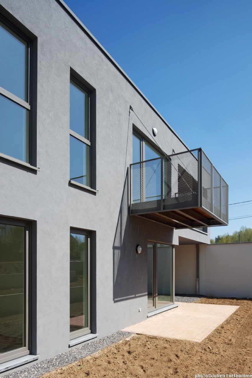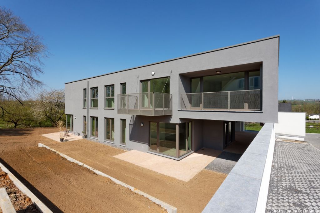Le rez-de-chaussée est habillé par une couche d’enduit de couleur gris clair appliquée sur isolant, tandis que le premier étage est de couleur gris plus foncé. Toutes les toitures sont des toitures vertes extensives. Les châssis sont en aluminium, avec un double vitrage. Les performances énergétiques se traduisent par une utilisation parcimonieuse du sol et une attention particulière portée à la mobilité. Le terrain a été également été utilisé de manière optimale tout en laissant une large zone verte commune en fond de parcelle. A l’extérieur, des aménagements tels que des rangements pour vélos favorisent la mobilité douce. La récupération de l’eau de pluie est assurée par des citernes tandis que les toitures vertes sont utilisées comme tampon avant la récupération de l’eau dans la citerne et son rejet vers le réseau public. Les citernes d’eau de pluie et toitures vertes ont aussi été prévues pour lutter contre la surcharge du réseau d’égouttage existant. Enfin, un maximum de zones vertes et revêtements de sol perméables ont été aménagés.